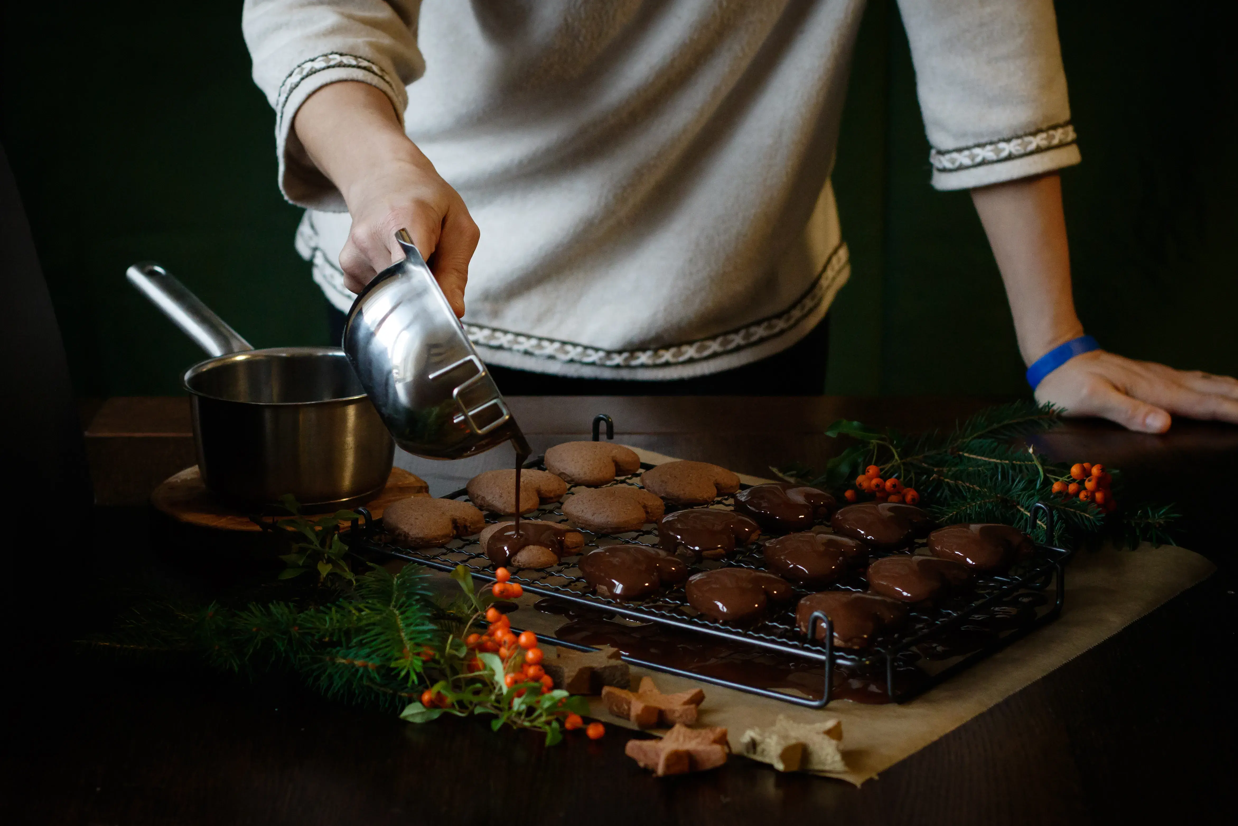 - Na polevu rozpusťte čokoládu ve vodní lázni (můžete ji povolit trochou tuku, ideální je kakaové máslo) a namočte do ní vrchní část perníčků. Polevu nechte zcela zaschnout.