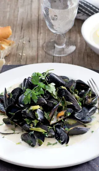 - Klasické Moules marinières, mušle s jemnou omáčkou z bílého vína, másla, šalotky a petrželky – a hlavně – dostanete k nim vynikající hranolky, které si do omáčky namáčíte.