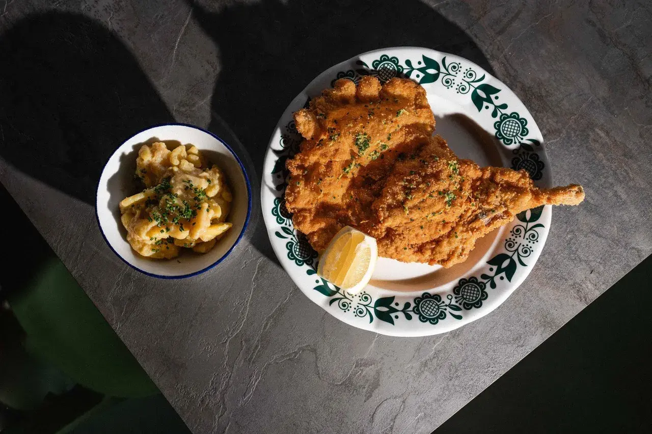 A samozřejmě řízky. Kromě zmiňovaného signature vepřového „šnyclu na kosti“ je tu vídeňský telecí (doplněný rovněž vídeňským bramborovým salátem) a také kuřecí stehenní řízek, který se podává v máslové bulce s ledovým salátem, estragonovou majonézou (recept na Punčochářovu estragonovou majonézu najdete v tomto videu) a marinovanými citrony.