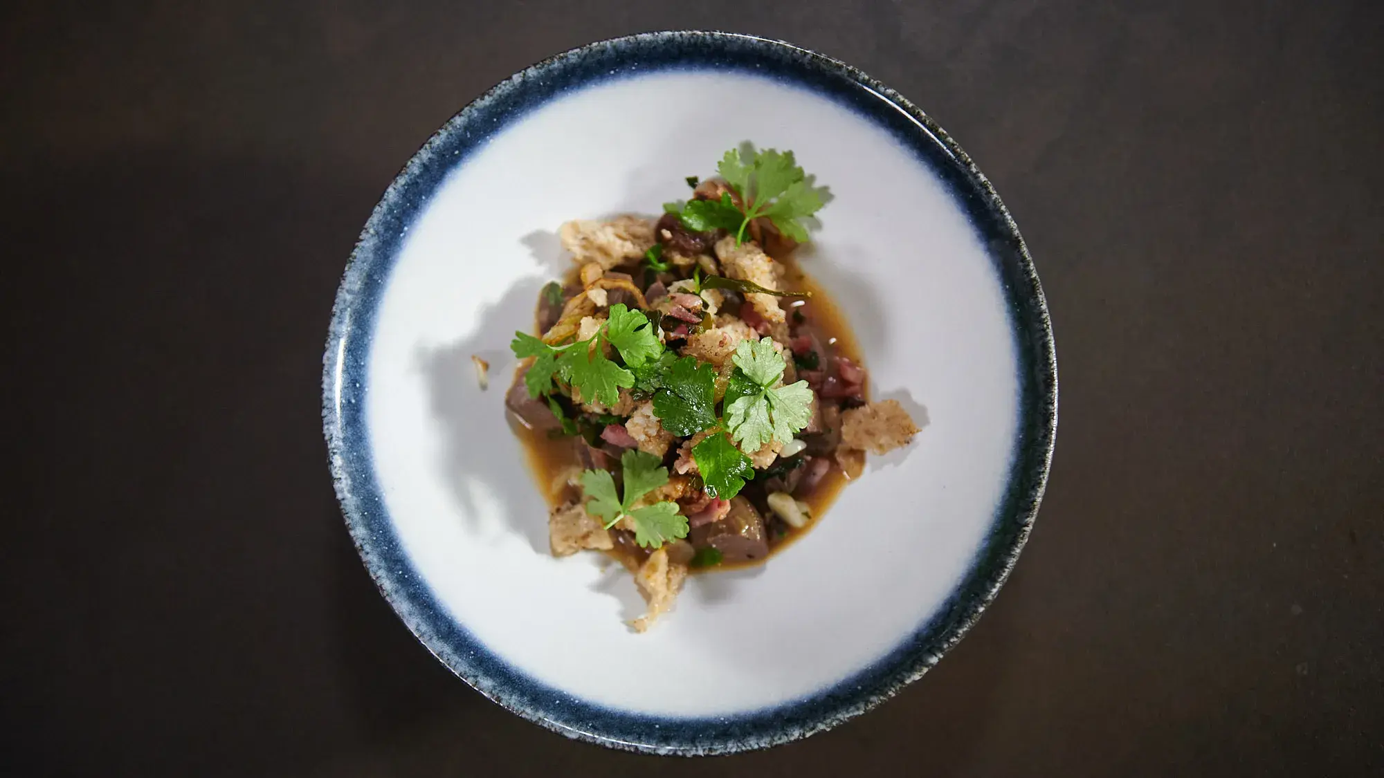 - Porci ragú v hlubokém talíři bohatě posypejte směsí s orestovanou slaninou a chlebem.