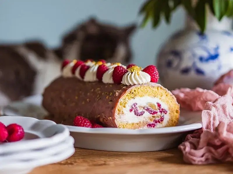 - Roládu opatrně rozložte a odstraňte utěrku. Potřete ji našlehaným čokoládovým krémem (malou část si schovejte na ozdobu) a poklaďte malinami (pár si jich schovejte na ozdobu). Ideální je každou malinu překrojit napůl. Roládu opatrně zabalte tak, aby byla co nejdelší – balte tedy od delší strany. Do cukrářského sáčku s trezírovací špičkou (zdobičkou) naneste zbytek krému a vložte do lednice.