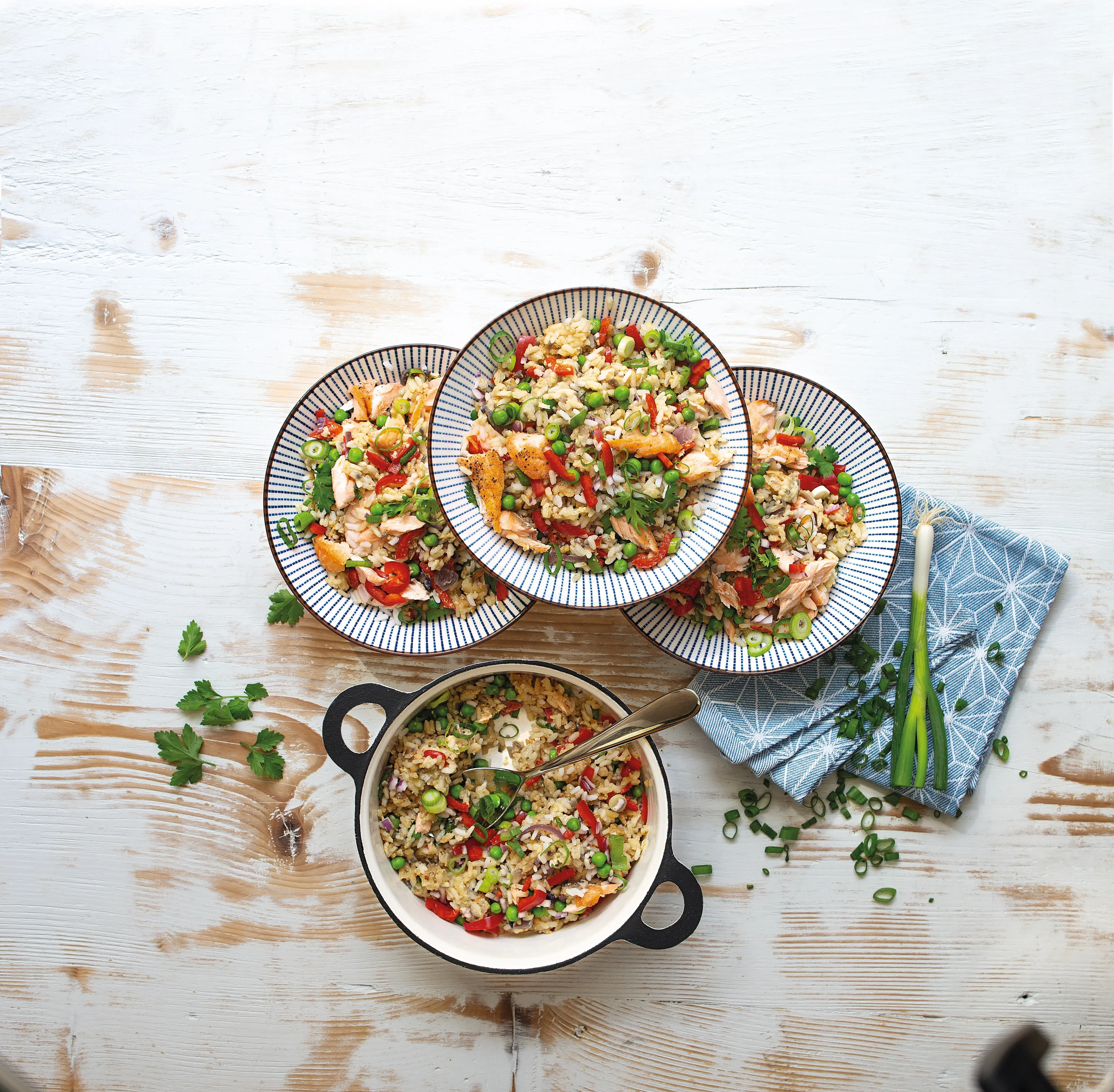 Zbytková rýže: Použijte rýži uvařenou předem a uchovávanou v lednici. Vhodná je zejména jasmínová rýže a rýže basmati, ale můžete využít i jiné druhy.