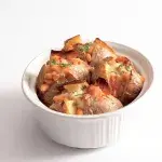 600 g drobnějších brambor vkuse promíchejte s trochou olivového oleje a mořské soli. Upečte je v troubě, při 200 °C to trvá asi 40 minut. Mezitím prohřejte asi 400 ml olivového oleje s bylinkami a rozmáčknutým stroužkem česneku, aby se vše rozvonělo, hodit se může i čerstvě mletý pepř a mořská sůl. Pak brambory vyndejte z trouby, pěstí je jednu po druhé rozmáčkněte (pozor, ať se nepopálíte) a vkládejte je do teplého olivového oleje. Nechte asi 15 minut odležet ve vypnuté, ale stále vyhřáté troubě.