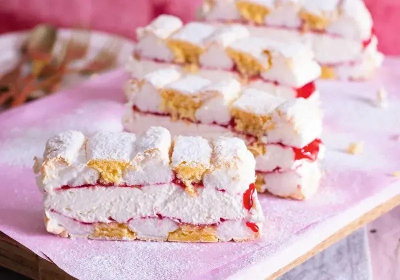 - Dva křehké korpusy z piškotového těsta a sněhu jsou potřené džemem a porcí nadýchané šlehačky.