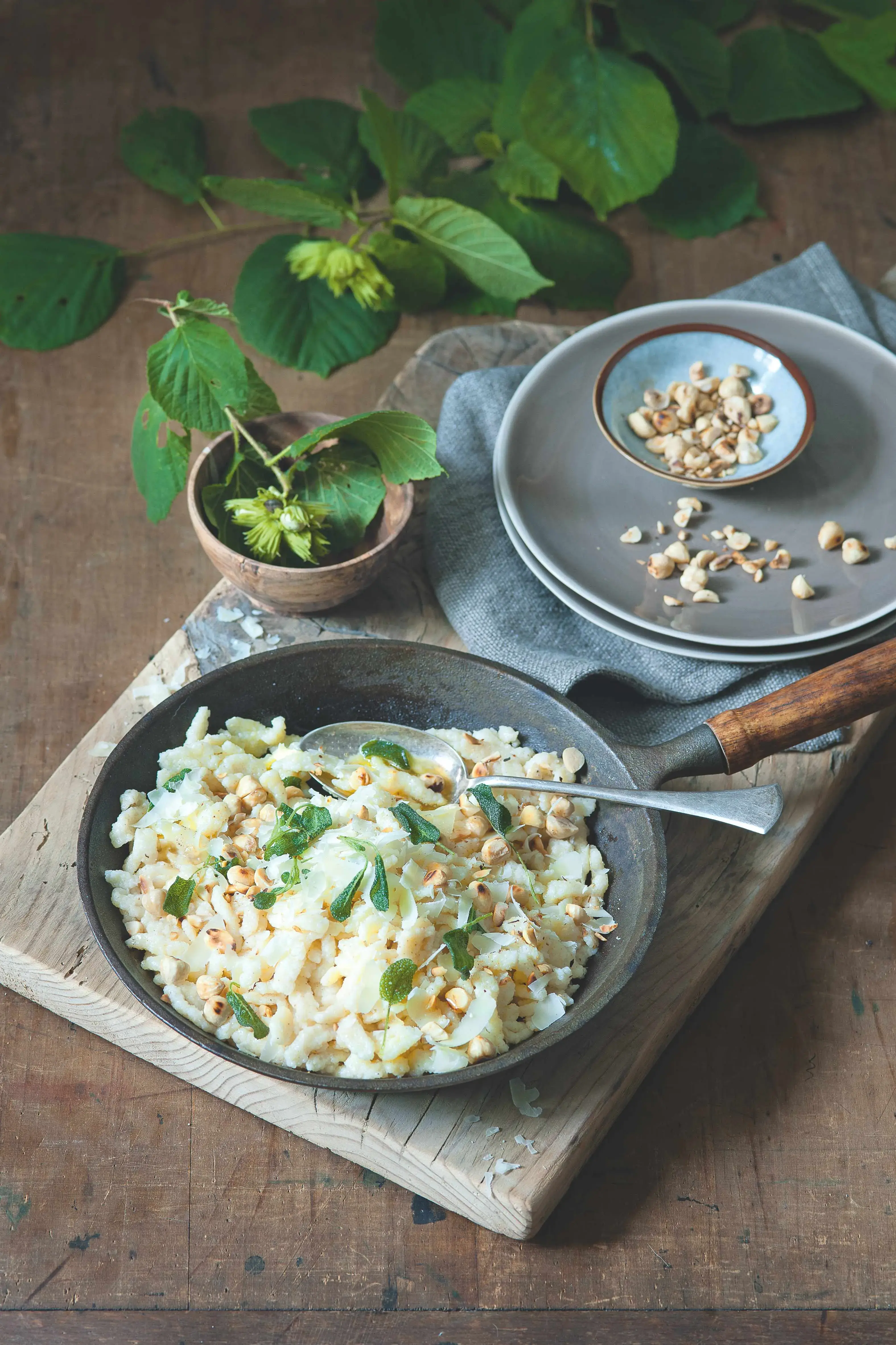 Špecle (z německého Spätzle) jsou malé moučné nočky, podobné slovenským haluškám. Přestože jim také sluší kombinace uzeného masa se zelím, my se rozhodli pro méně všední záležitost. Tou je spojení opečených lístků čerstvé šalvěje, lískových oříšků a parmazánu.