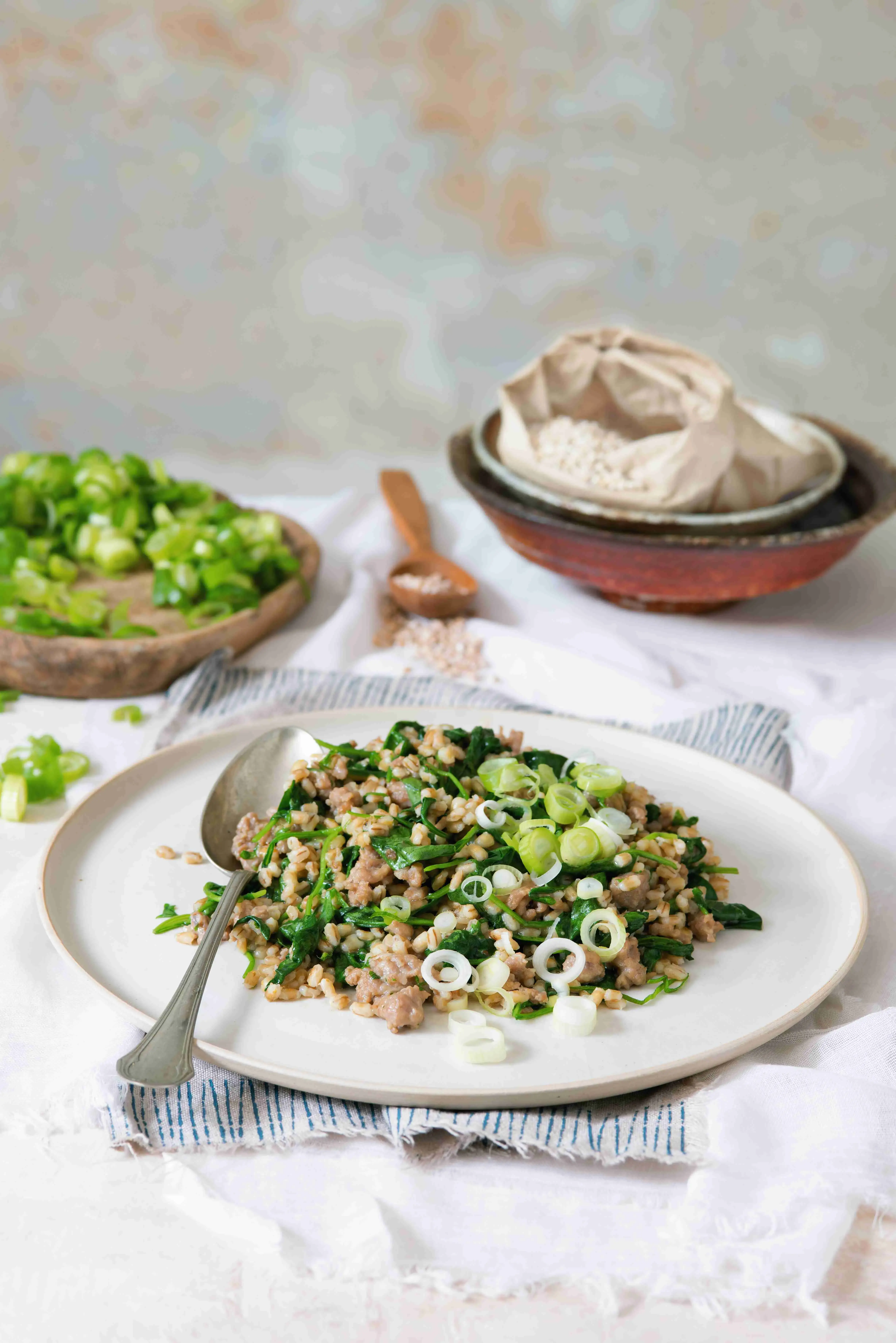 Mám ráda jídla typu „rýže s něčím“, kdy na pánvi osmažím cibulku, přidám zeleninu, někdy i maso a k tomu uvařené obiloviny. Často rýži a někdy také bulgur, pohanku nebo kroupy. Pokud si na improvizaci ze začátku netroufnete, vyzkoušejte tento recept z krup, mletého masa a špenátu.