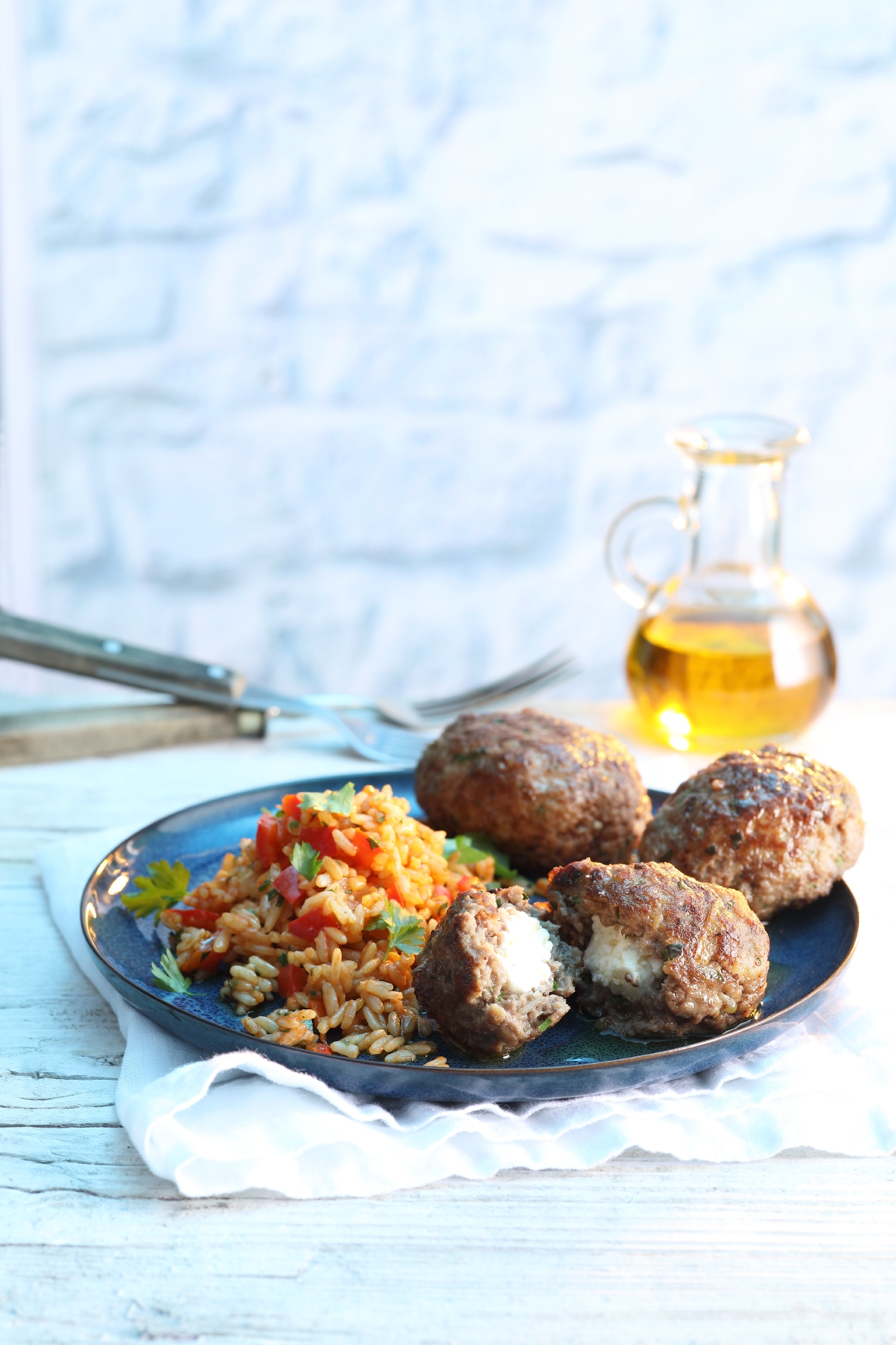 Kombinace karbanátků s rýží je pro našince trochu neobvyklá, ale jen proto se nenechte od této řecké pochoutky odradit. Masové placičky v sobě ukrývají sýr feta, díky kterému jsou neuvěřitelně šťavnaté. Pravou fetu lze vyměnit za jakýkoli jiný sýr balkánského typu, třeba ten, který vám zbyl z předchozího receptu.