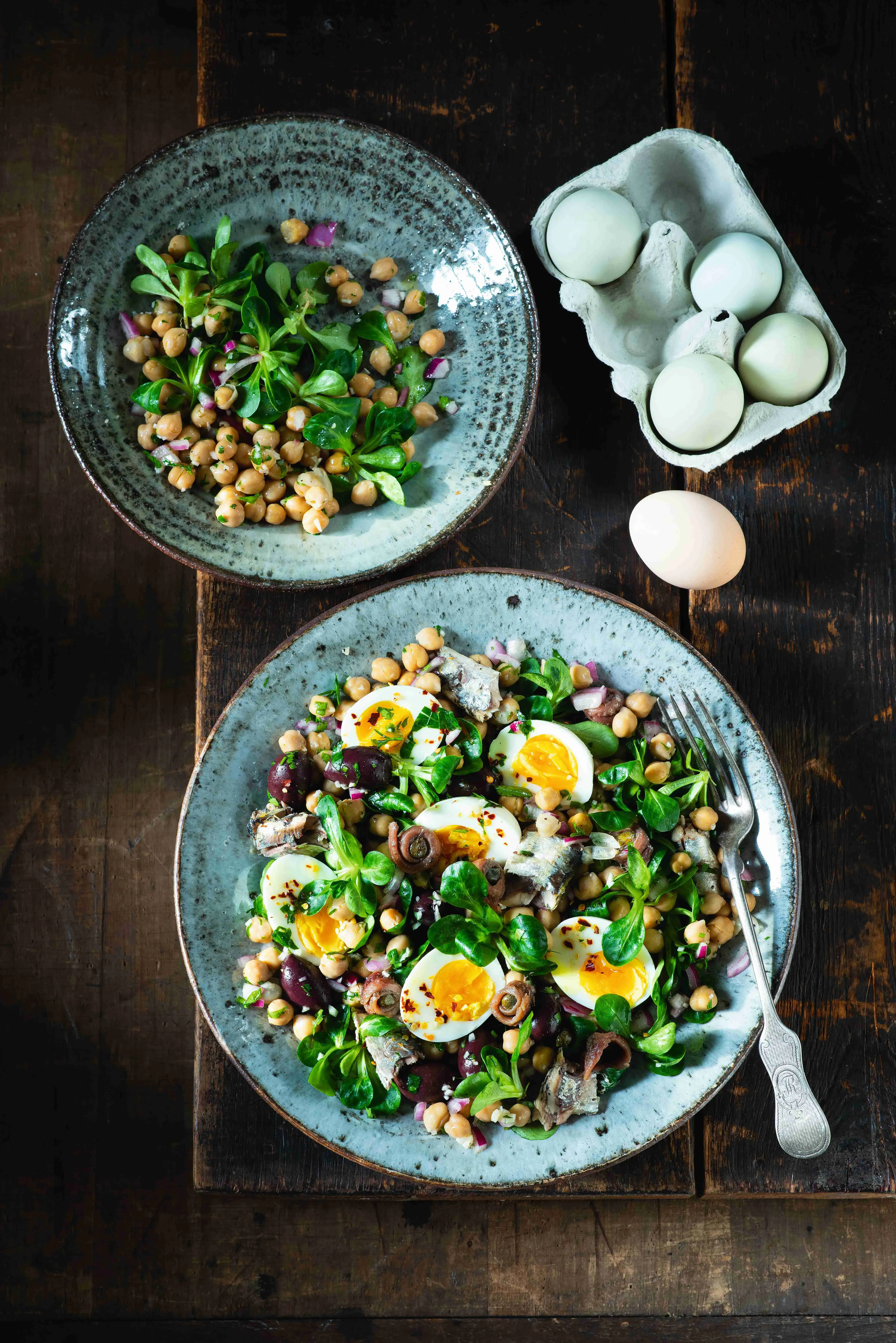 2. Cizrnový salát s vejci a rybičkami