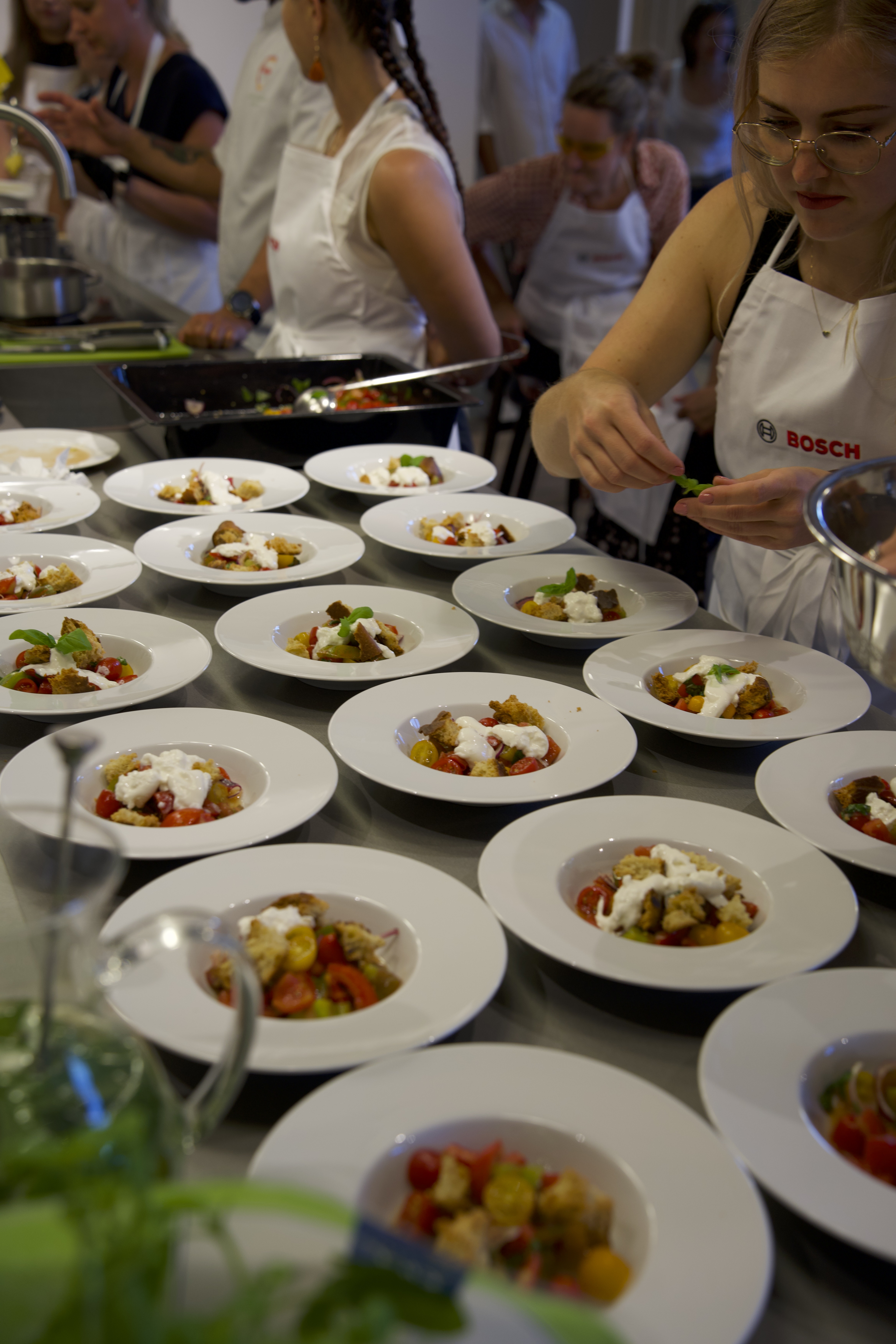 A jak se nám se spotřebiči Bosch vařilo? Začali jsme salátem panzanella s rajčaty, kde se upotřebí staré upečené pečivo. Díky technologii 4D horký vzduch se dá v troubě péct až na 4 úrovních najednou.