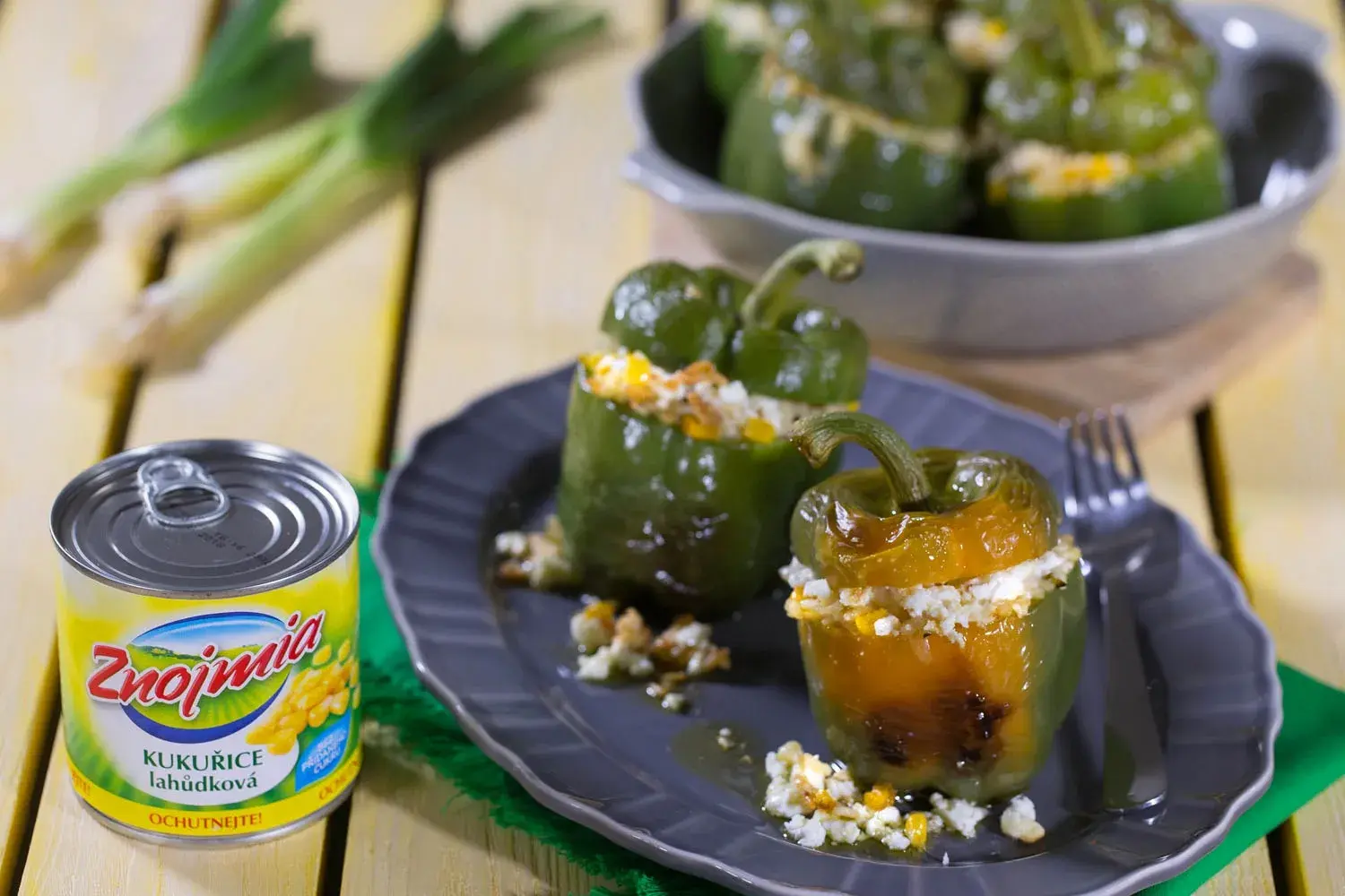- Každou papriku omyjte, odkrojte vršek a zbavte semínek. Naplňte hotovým rizotem a vložte do pekáče nebo zapékací misky zlehka potřené olejem. Posypejte nadrobenou fetou a dejte na 15 minut zapéct.