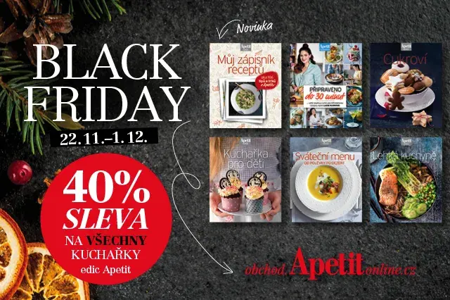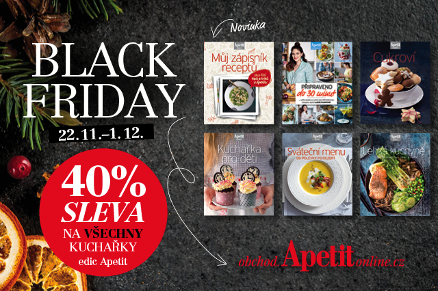 Pokud také patříte k milovníkům kuchařek, máme pro vás ty nejlepší zprávy! Od 22. 11. do 1. 12. 2019 bude v našem on-line obchodě www.obchod.apetitonline.cz probíhat nejpopulárnější slevová akce na světě – Black Friday. Všechny kuchařky (včetně letošních novinek) pořídíte se slevou 40 %! Pořiďte vánoční dárky za nejlepší ceny nebo si udělejte radost a zpříjemněte den sami sobě. Můžete k nám poslat i Ježíška, určitě bude vědět, co vás nejvíc potěší. Je opravdu z čeho vybírat!