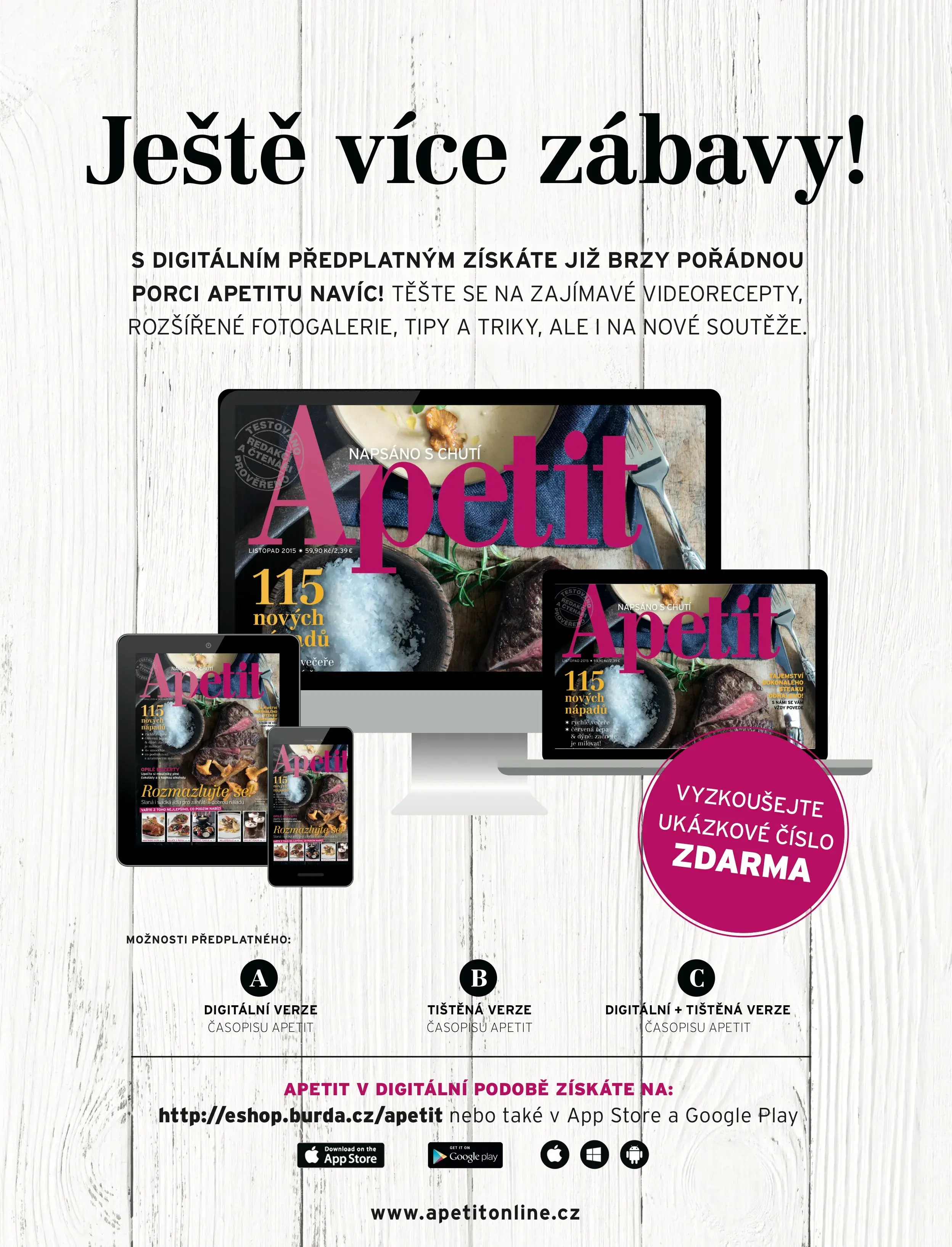 Digitální předplatné časopisu Apetit nyní koupíte na eshop.burda.cz/apetit. K dispozici je také kombinované předplatné, kdy za zvýhodněnou cenu pořídíte tištěný i digitální Apetit. Mňam!