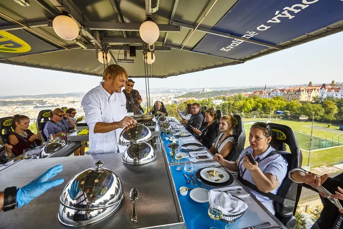 Nezvyklý kulinární zážitek si od 6. do 16. září můžete dopřát v Praze. Plošina je strategicky umístěna na kopci v krásné zeleni Riegrových sadů na Vinohradech, takže když s hosty vyjede do výše padesáti metrů, mají celé město pod sebou jako na dlani.
