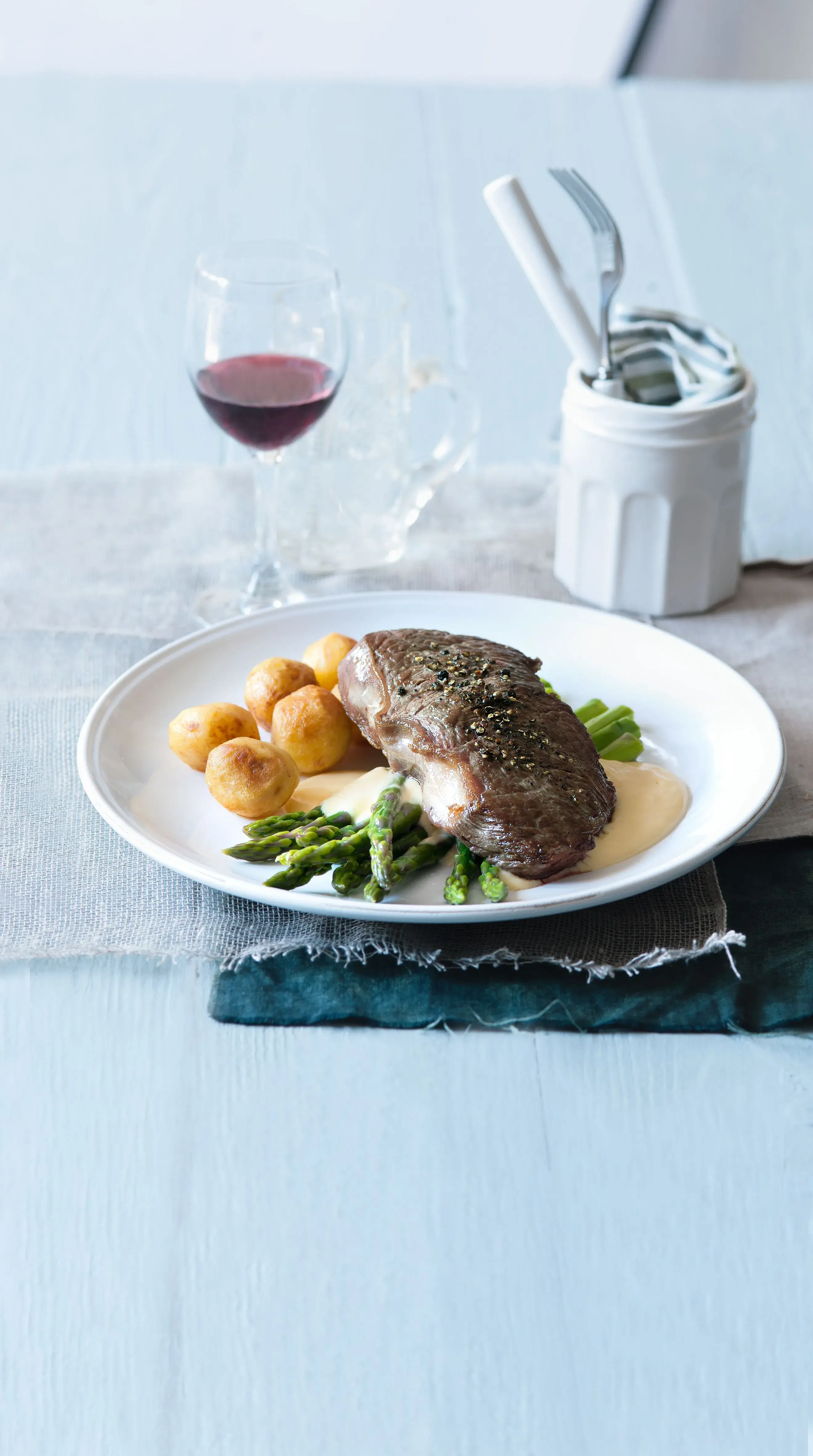 Skvělý chřest s hedvábně jemnou holandskou omáčkou posouvá hovězí steak k výšinám! Hlavní chod skvěle doladí sklenka suchého červeného vína s plnou chutí Zédé de Labégorce Margaux AOC.