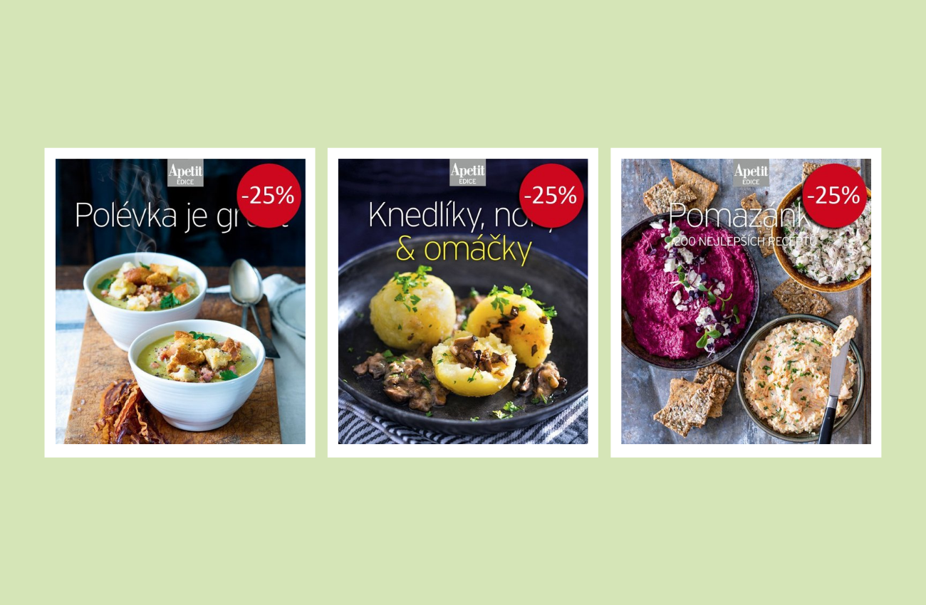Rozšířili jsme pro vás místa, kde koupíte kuchařky z Edice Apetit. Nově je nyní najdete také v síti obchodů společnosti DATART. V Edici Apetit už vyšly kuchařky Koláče, Polévky a Maso. Všechny tři si můžete od 6. května 2011 prohlédnout a zakoupit také v obchodech společnosti DATART. Kuchařky najdete v prodejnách u kuchyňských spotřebičů. Cena každé kuchařky je 299 Kč.