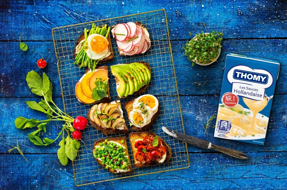 - Všechny chleby potřeme THOMY Majonézou a obložíme připravenými ingrediencemi dle obrázku.