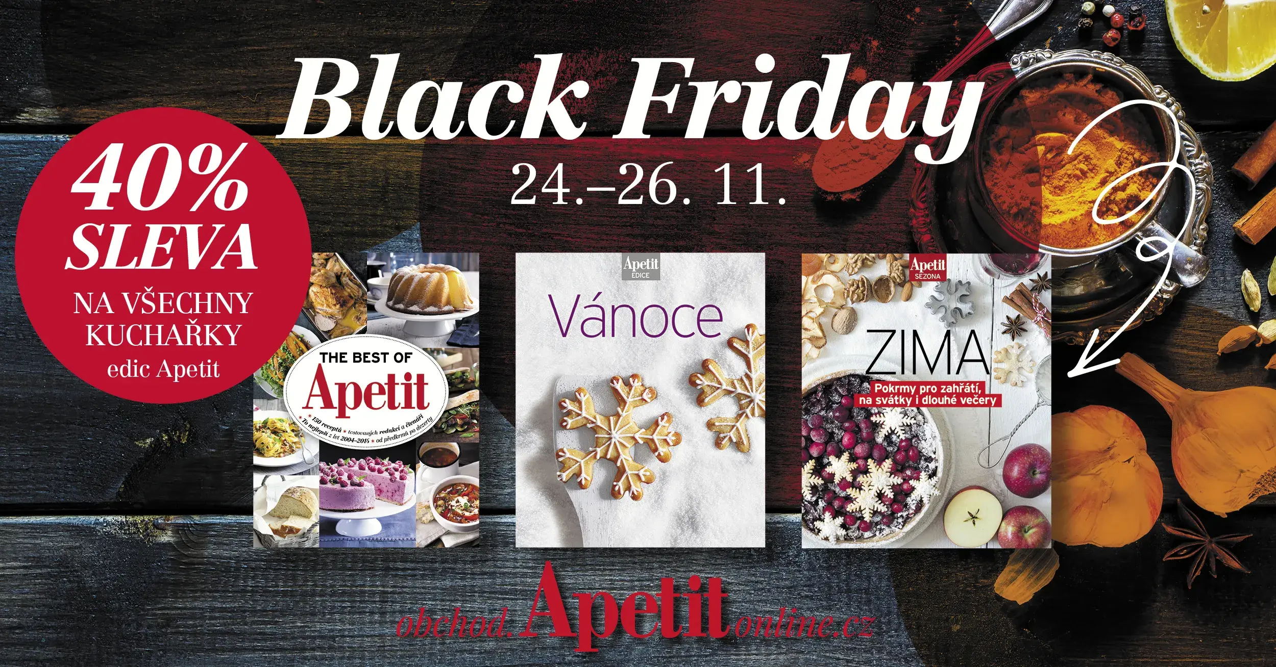 Už v pátek 24. 11. startuje na www.obchod.apetitonline.cz nejpopulárnější slevová akce na světě - Black Friday. I vy, naši čtenáři, se tak můžete těšit na neuvěřitelné slevy. Doplňte svou sbírku o nové kousky... Máte opravdu z čeho vybírat. Od pátku 24. 11. do neděle 26. 11. máte možnost nakoupit jakoukoliv z našich kuchařek se slevou 40%!