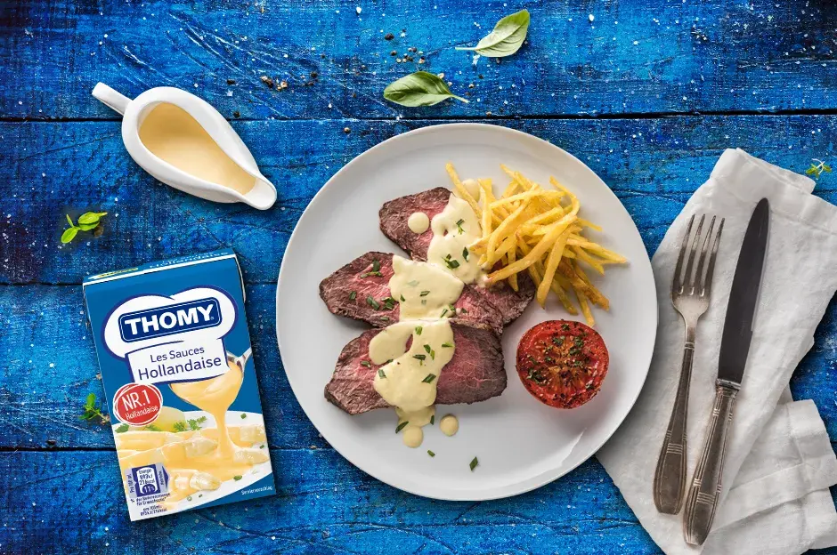 7 Maso servírujeme spolu s holandskou omáčkou, opečenými bramborami a grilovanými rajčaty. Dobrou chuť!