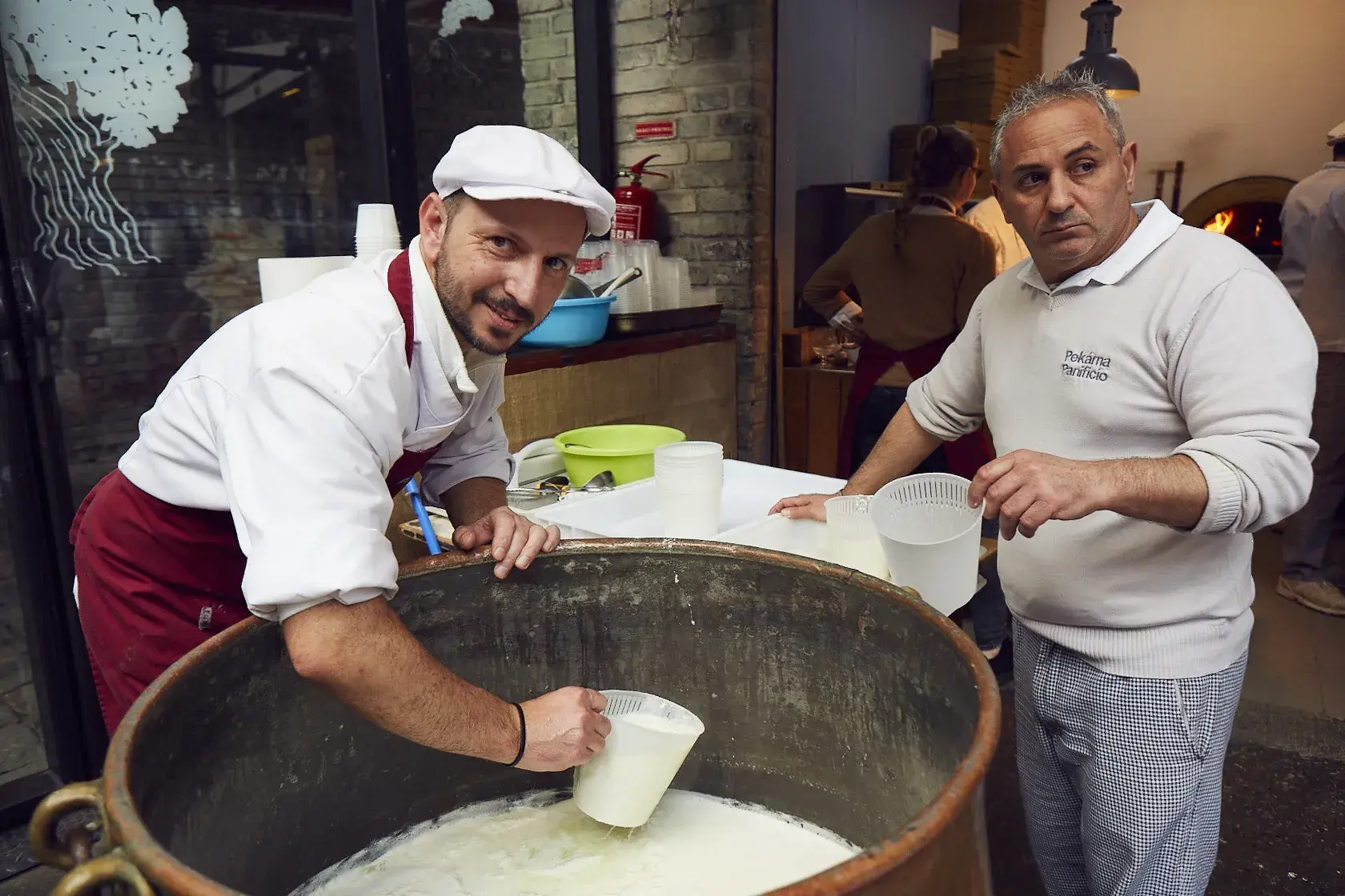 Teď nastává čas na samotnou ricottu. Sýrař ještě před tím vypumpuje z kotle veškerou syrovátku, aby vybral i sýrové zrno na dně. Pak se syrovátka vrátí zpátky do kotle a přidá se dalších 25 litrů mléka a sůl. A znovu se tekutina zahřívá, dokud nevystoupá na 85 stupňů. Davide místo vařečky bere do rukou modré košťátko. Vypadá jako na úklid, ale slouží coby chytrá míchačka, která stírá i stěny kotle. A míchá a míchá, zvolna a klidně – není to proces pro netrpělivé. Po zhruba půlhodině začne stoupat ke hladině kotle pěna. A pod ní se začíná tvořit ricotta. Je mnohem jemnější než předešlý čerstvý sýr. Davide sebere nejdříve šetrně pěnu a pod ní už je hebká a voňavá ricotta.