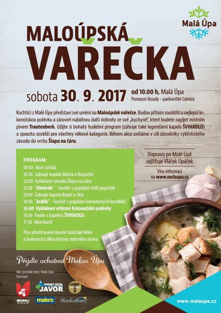 Maloúpští kuchtíci představí krkonošské speciality a budou soutěžit o nejlepší krkonošškou polévku! Těšit se můžete i na další doprovodný program. Třeba na soutěže o Jedlíka spočívající v pojídání borůvkových knedlíků a titul o největšího ohniváka v pojídání chilli papriček. Bude se pít pivo z místního pivovaru Trautenberk, o zábavu se postará David Andrš, který naučí bubnovat malé i velké. K tanci a k poslechu zahraje Marta a Rasputin, Band-a-SKA a kapela Švihadlo. Kdo vyhraje titul a odnesesi prvenství za nejlepší krkonoškou polévku?