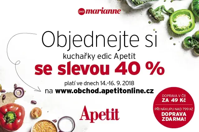 Slevy platí pro všechny edice kuchařek Apetit. Od pátku 14. do neděle 16. září na obchod.apetitonline.cz výhodně nakoupíte i úplné novinky, jako je Lehká kuchyně či BEST OF APETIT: Těstoviny - 150 nejlepších receptů. Za dopravu nyní zaplatíte pouze 49 Kč v rámci ČR, pokud ovšem nakoupíte nad 799 Kč, máte ke své objednávce dopravu zdarma.