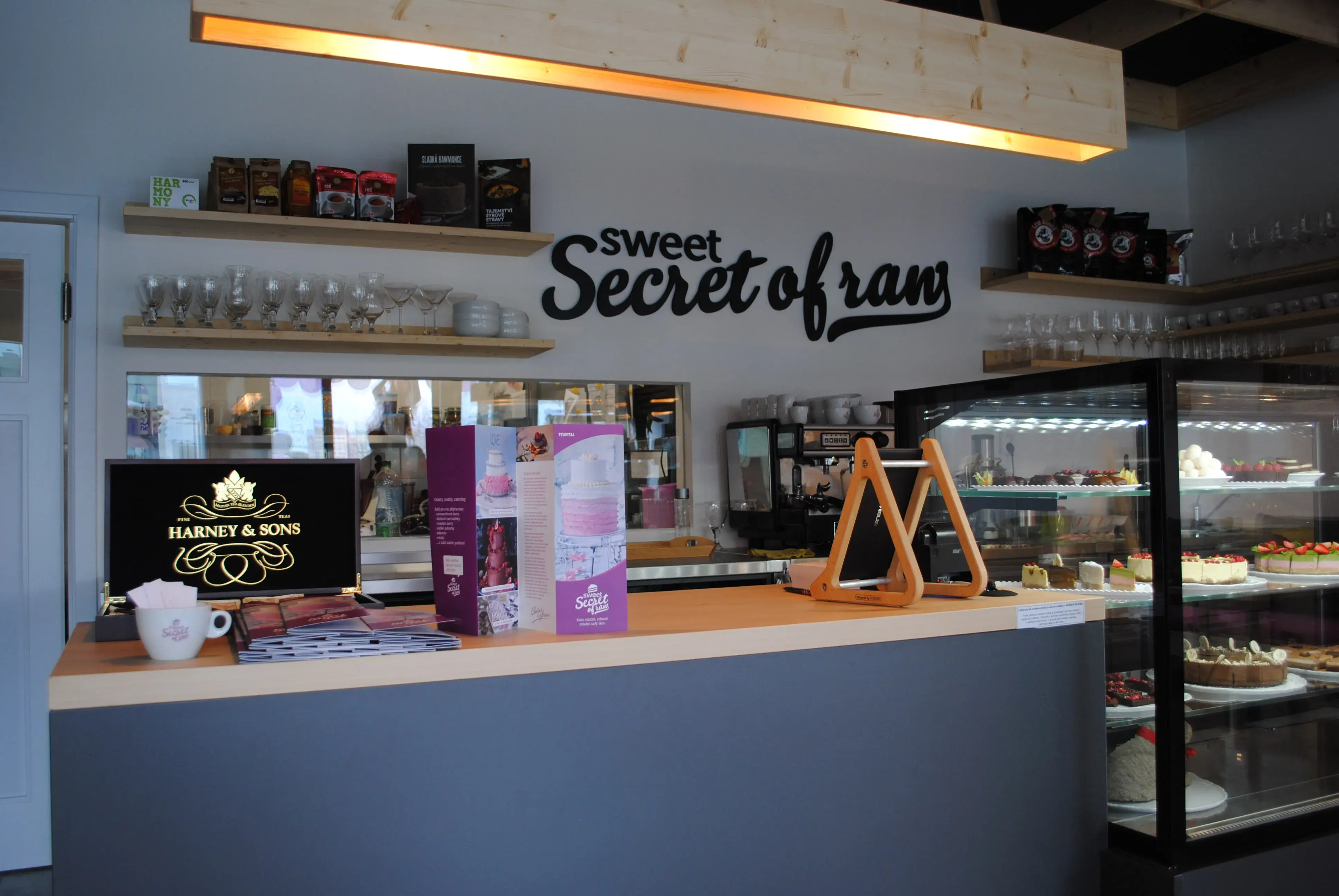 Koncept a interiér kavárny ozdobí recyklovaný nábytek z palet a světlý, příjemný prostor, který je společný pro všechny pobočky Sweet Secret of raw. Pojme zhruba 16 lidí, kteří si kromě vynikajících sladkostí můžou pochutnat na lahodné kávě z kolumbijských zrnek Los Andes, pražených v soukromé pražírně poblíž Prahy. Majitelé upozorňují, že půjde o jedinou položku na menu, která nebude raw.