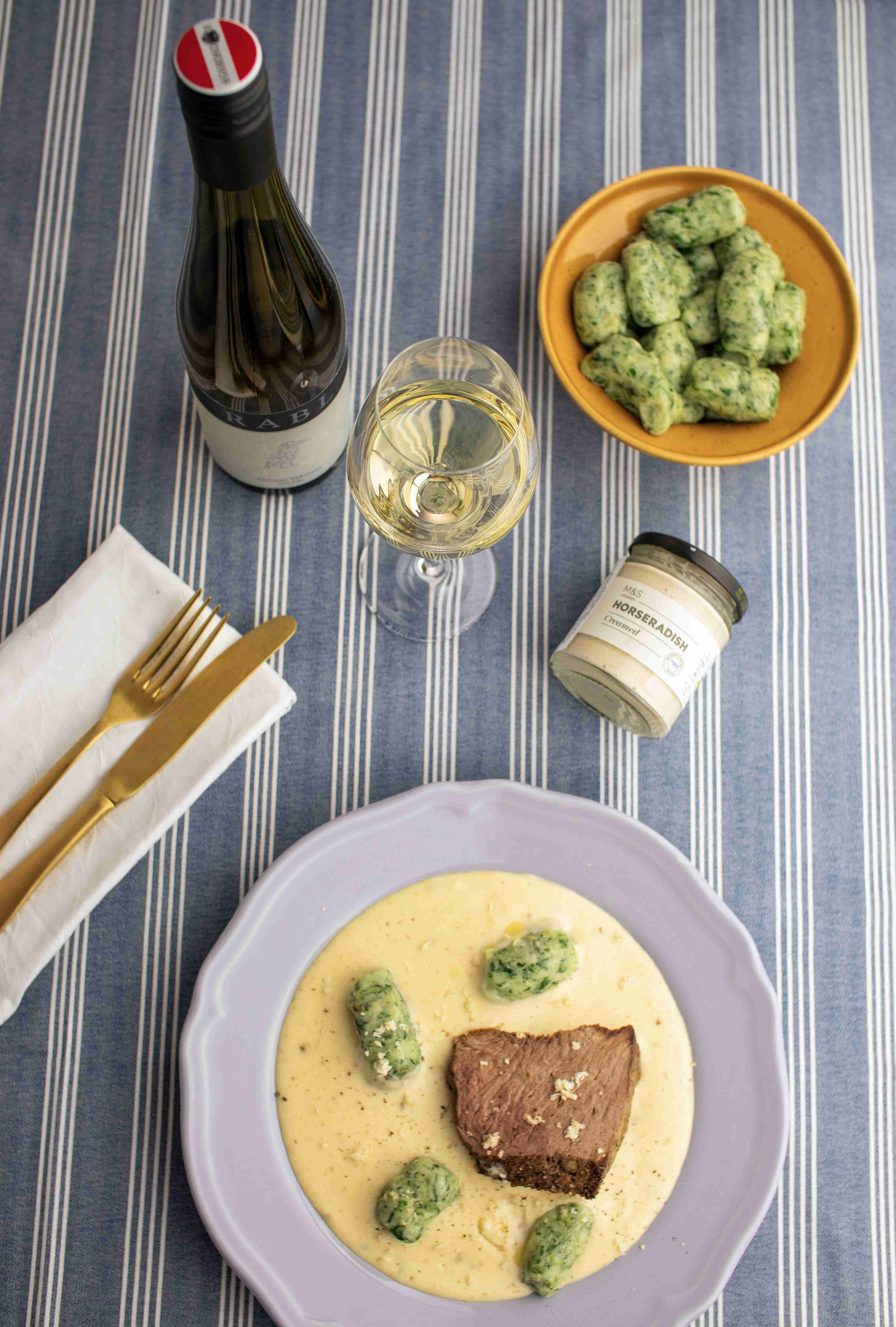 Křenová omáčka s hovězím masem M&S a domácí bramborovo-špenátové šišky