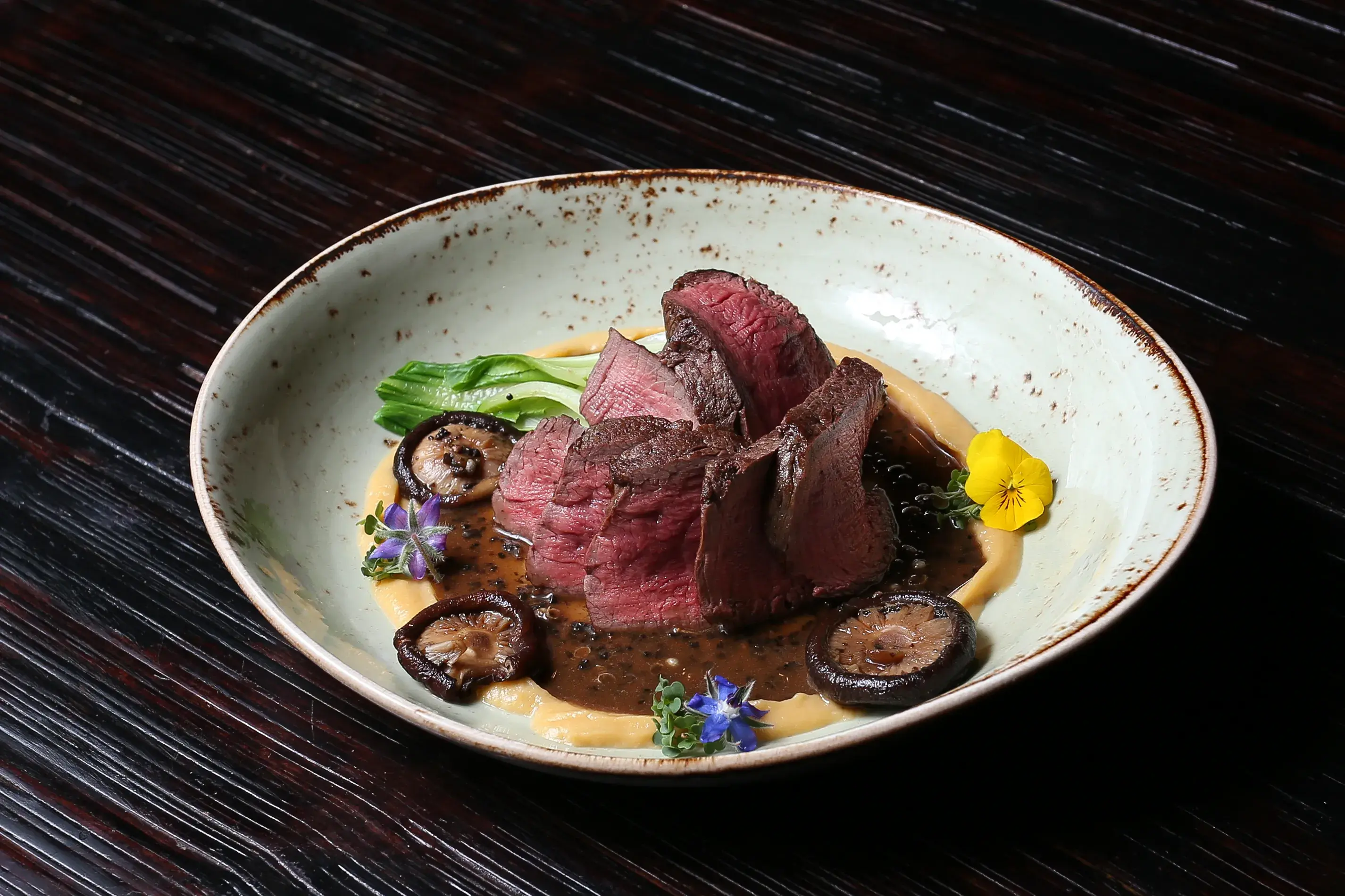 To nejjemnější maso z hovězí svíčkové upravené na přání hosta a nakrájené na tenké plátky, podávané s výraznou omáčkou ze sečuánského pepře a lanýžů a s pyré ze sladkých brambor, houbami shitake a pak choi.