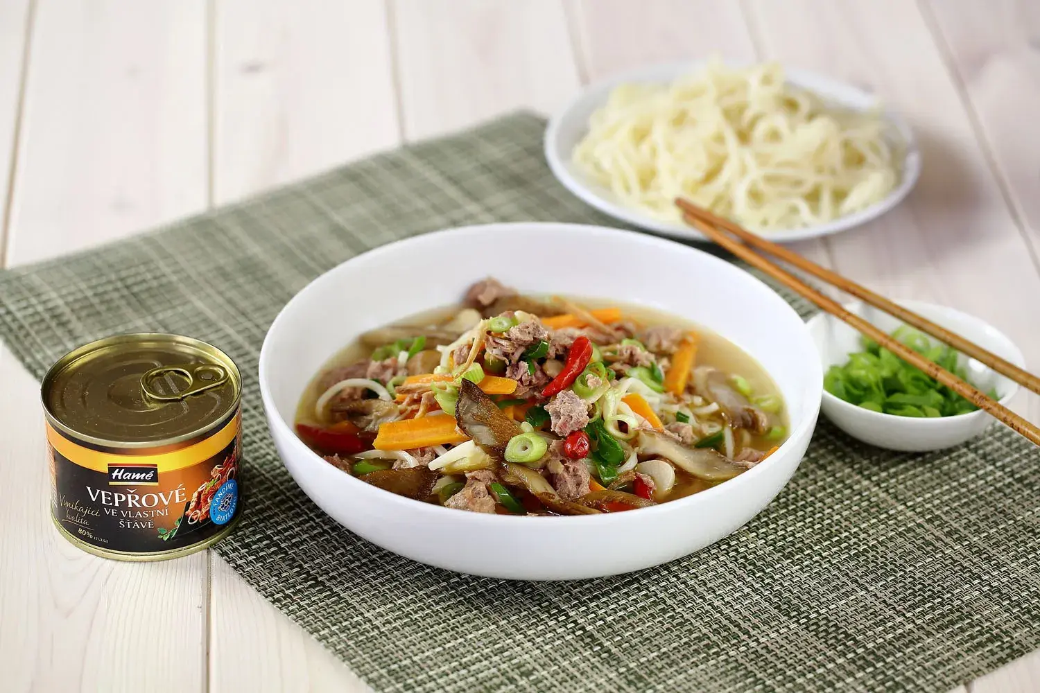 2 Z vepřového masa Hamé odeberte přebytečnou šťávu a tuk a rozdělte po vláknech. Přidejte ho ke konci vaření do polévky spolu s nakrájenou jarní cibulkou. Pokud máte rádi pikantní chutě, přidejte i chilli papričku. Nakonec dochuťte rybí omáčkou.