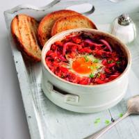 - Do směsi se poté vyhloubí důlky, do nich se opatrně vyklepnou vejce. Pánev se zakryje poklicí a za mírné teploty se vejce nechají dojít požadované konzistence. Bílky by měly být pevné, žloutky zhoustnou, ale zůstanou stále trochu vláčné.