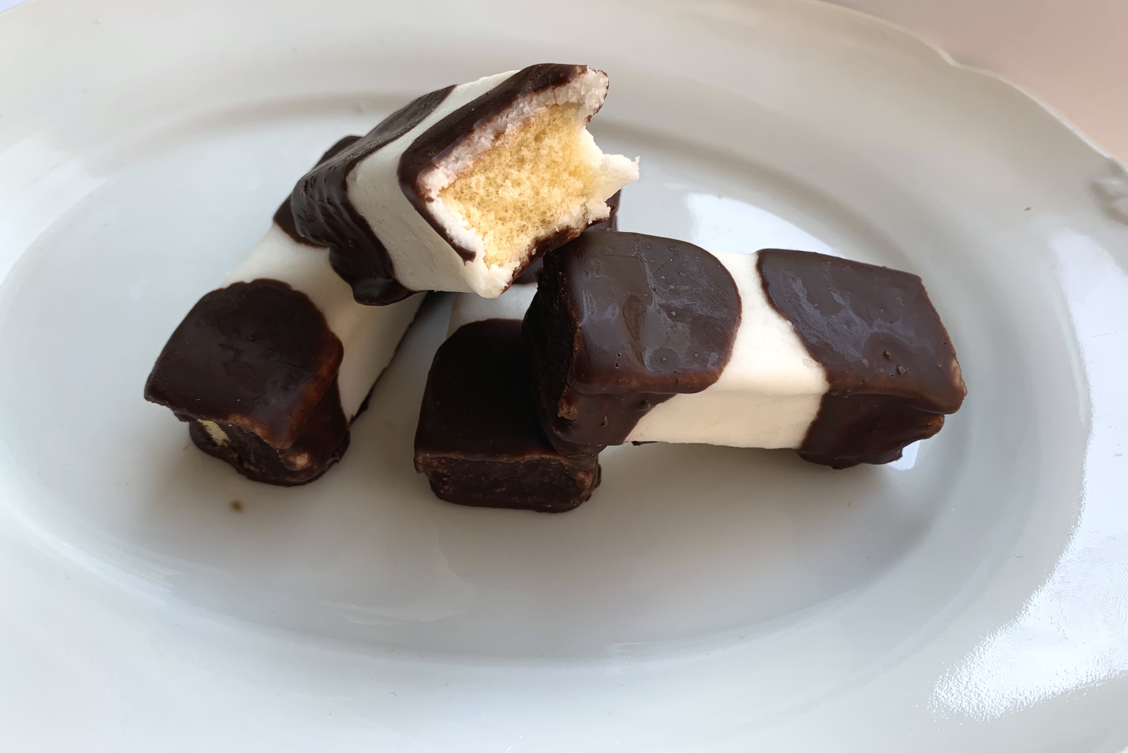 - Sladký základ je namísto v marcipánu obalený v bílém fondánu a z obou stran namočený namísto v čokoládě v tmavé tukové polevě.