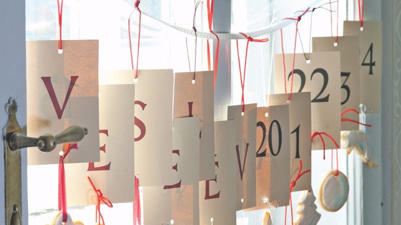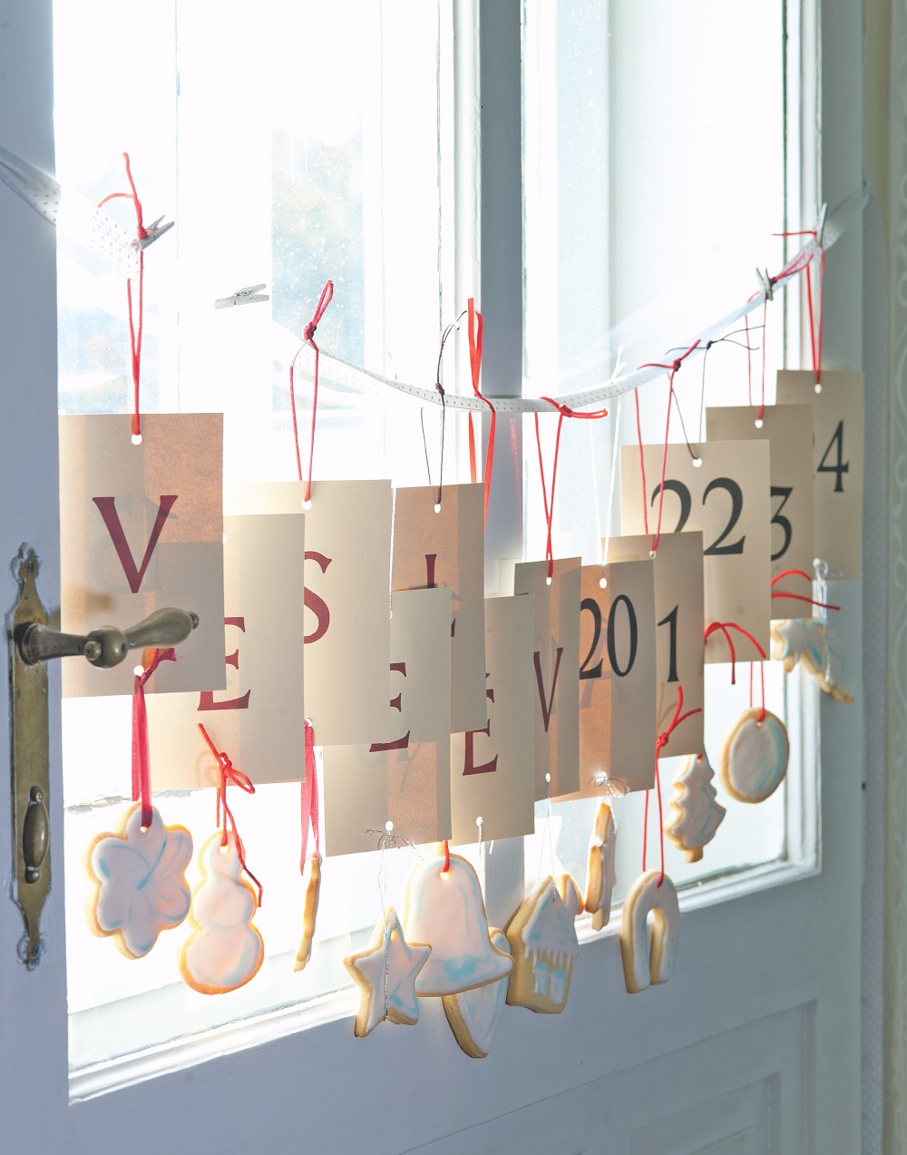 Na kartičky můžete navěsit sušenky ve tvaru hvězdičky, podkovy, zvonečku... Každý den pak podle data jednu kartičku otočte, a až se objeví celý nápis VESELÉ VÁNOCE nebo třeba verš z nějaké koledy, přijde Ježíšek! Sušenky můžete průběžně ujídat.
