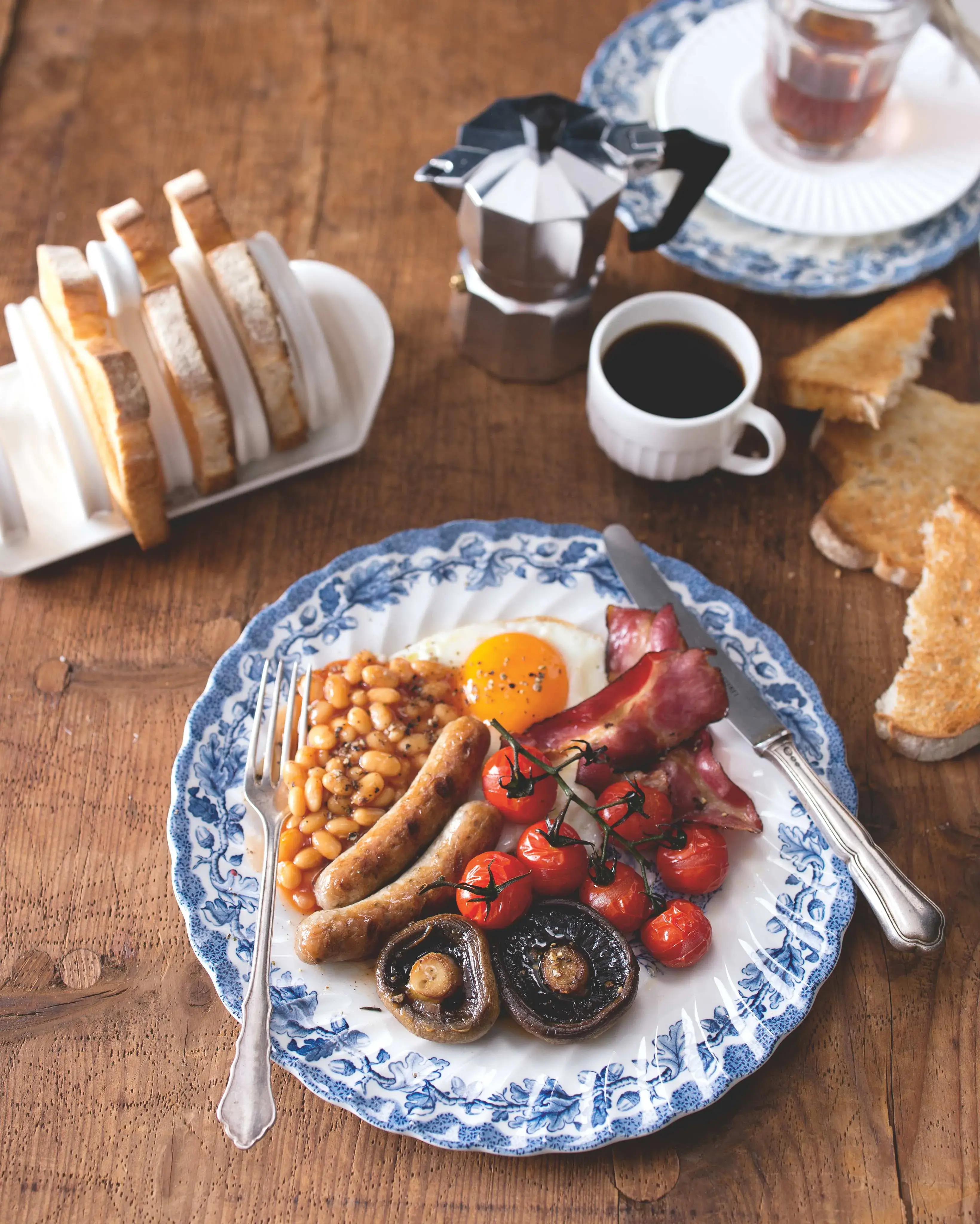 Anglická snídaně má pět základních komponentů: maso (slanina a klobásky), volské oko, fazole, rajčata a tousty. Všechno ostatní je už na vás: žampiony, opečené brambory atd. Užijte si víkendové ráno tak, jako Angličané a dopřejte si pořádnou dávku bílkovin, která vás nasytí na několik hodin.
