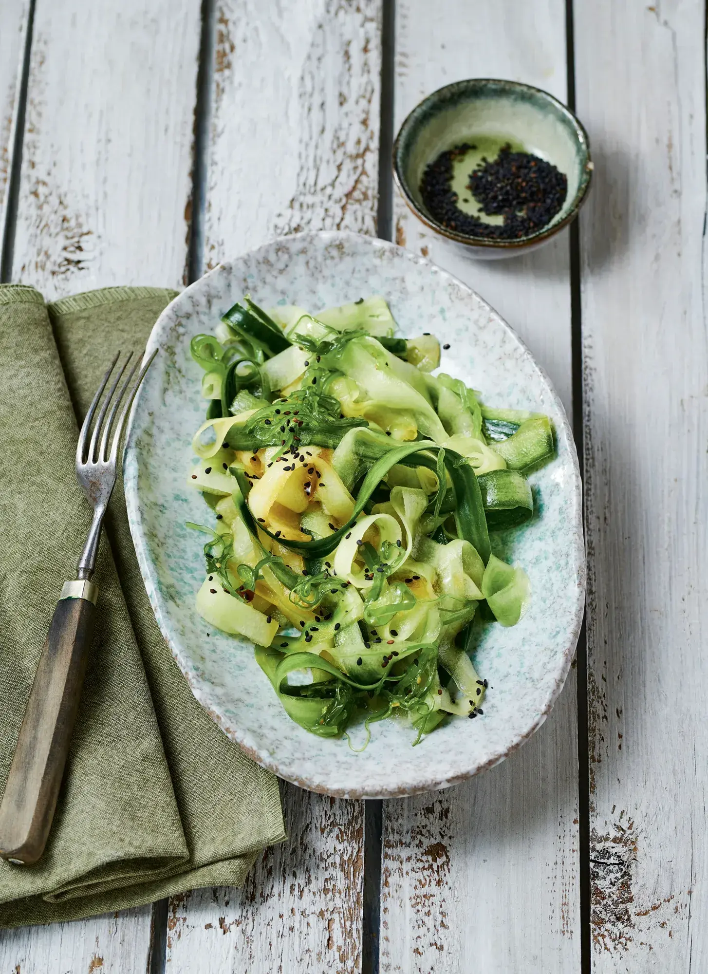 Křupavé okurky, jemně pikantní zálivka a mořské řasy wakame. Lehký salát s japonským nádechem, který zvládnete za pár minut. Rychlá a lehká příloha k asijským jídlům.