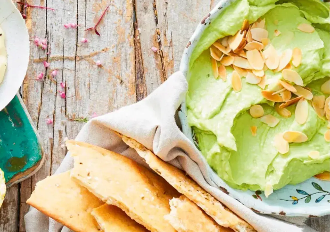 Jednoduchý avokádový dip a ještě jednodušší chlebová placka – tahle dvojka vás zachrání, když potřebujete rychlou a výživnou svačinu. Skvěle ale obstojí i jako stylové pohoštění na party nebo rodinnou oslavu.