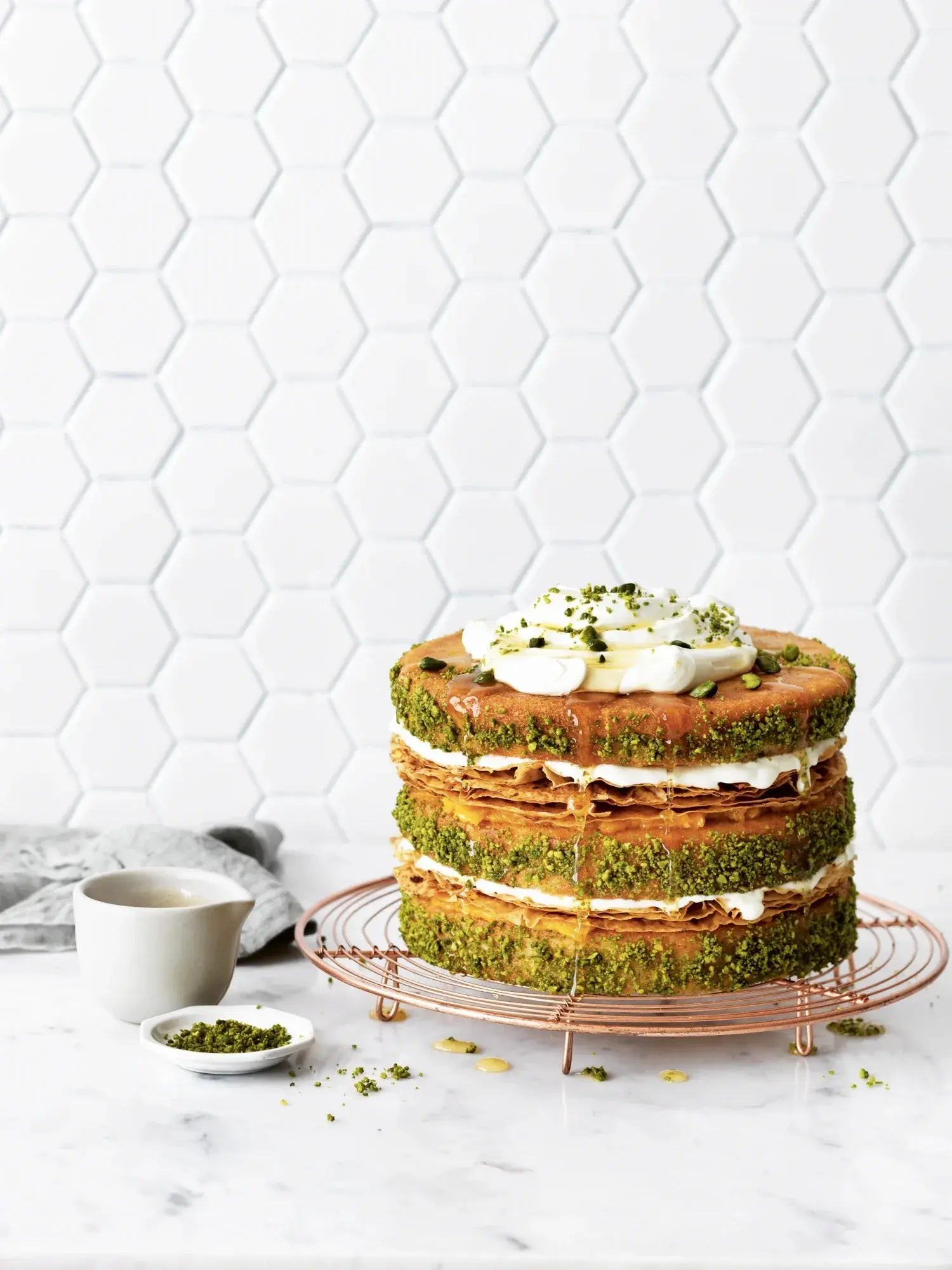 Baklavový dort s meruňkami a pistáciemi kombinuje klasický korpus, křupavé filo těsto, jemný krém a sladký sirup. To vše doplněné o sekané pistácie. Už se vám sbíhají sliny? Není na co čekat, recept vyzkoušejte a dort si upečte.
