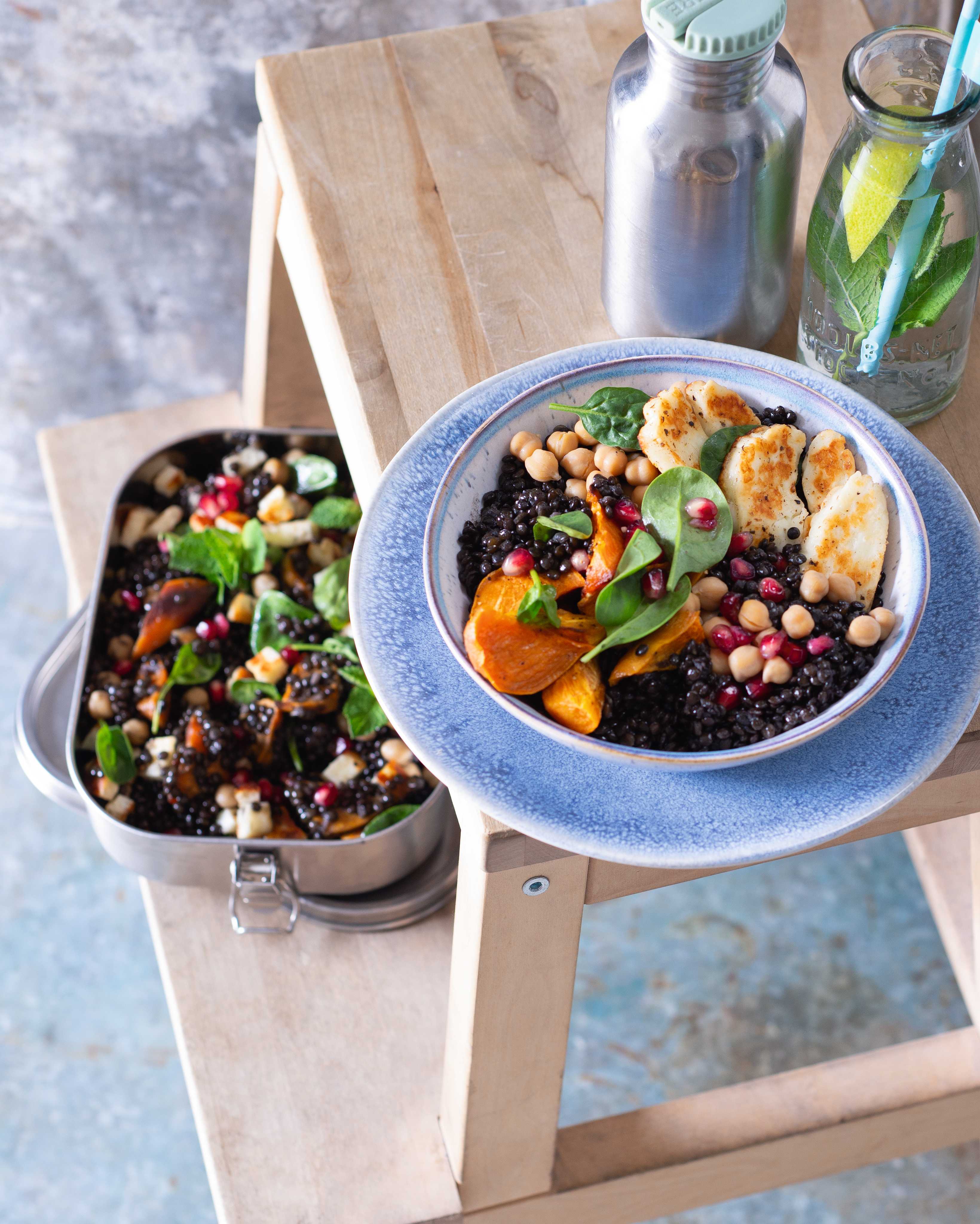 Jídlo ve stylu chytré horákyně – k čočkovému základu si každý přidá, co má nejradši. Co se nesní, přijde do salátu. Barevná miska s čočkou a halloumi je sytý luštěninový salát plný bílkovin.