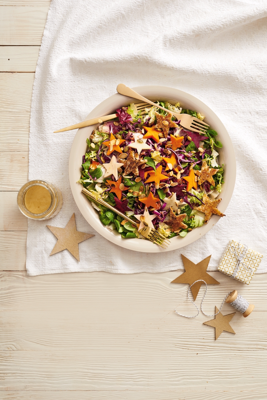 Barevný vánoční salát láká na svěží křupavou zeleninu, hravé hvězdičky a lahodnou zálivku. Takový salát na Štědrý den jistě zaujme všechny členy domácnosti i hosty.