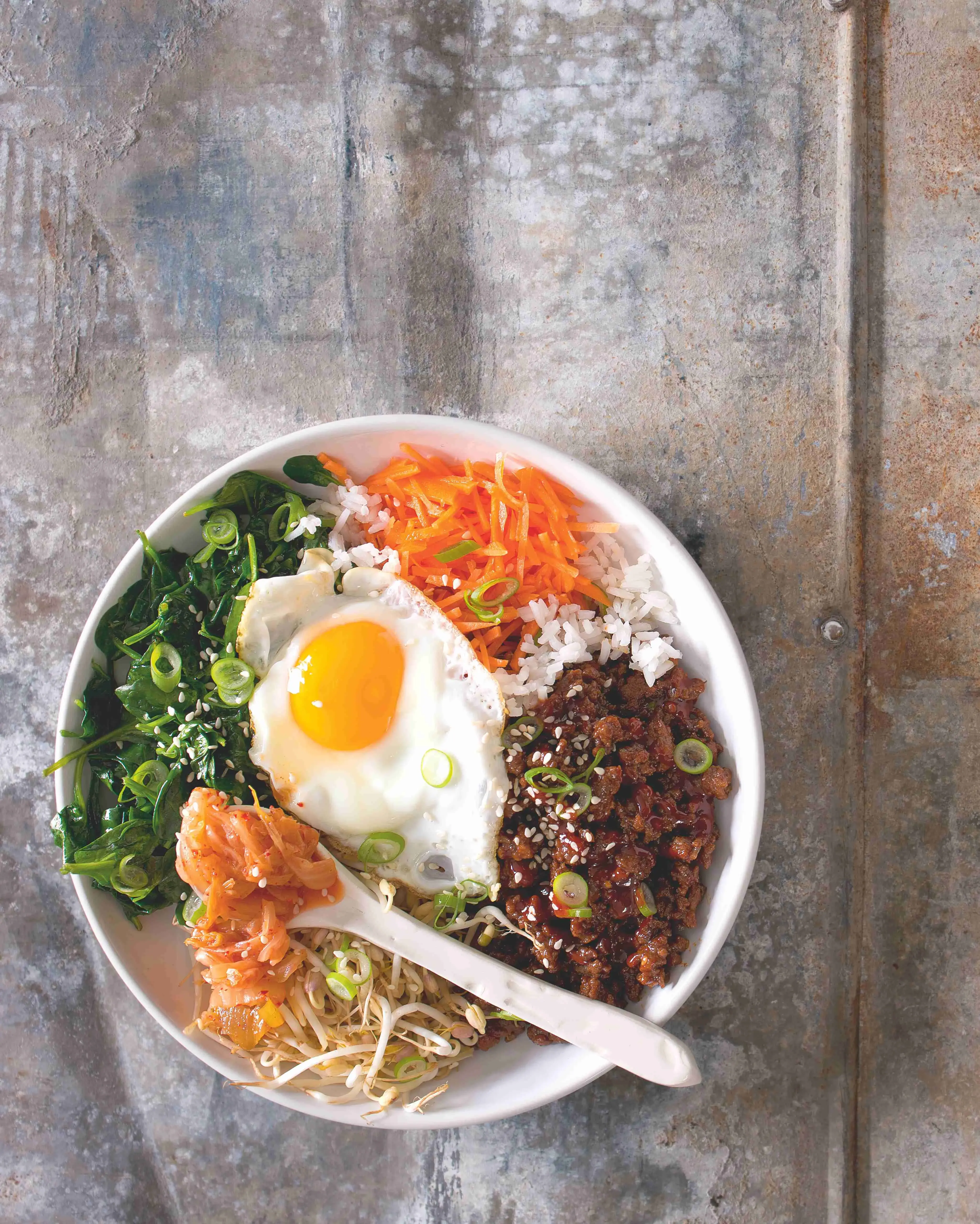 Korejské jídlo bibimbap (v překladu míchaná rýže) je variace na večeři ‚co dům dal‘. Rýži se zeleninou můžete doplnit i plátky syrového nebo vařeného masa, tofu, místo volského oka přidat omeletu. Zkrátka jídlo, na které nepotřebujete žádný přesný recept. Ovšem kdyby přeci jen, tak tady je ten náš.