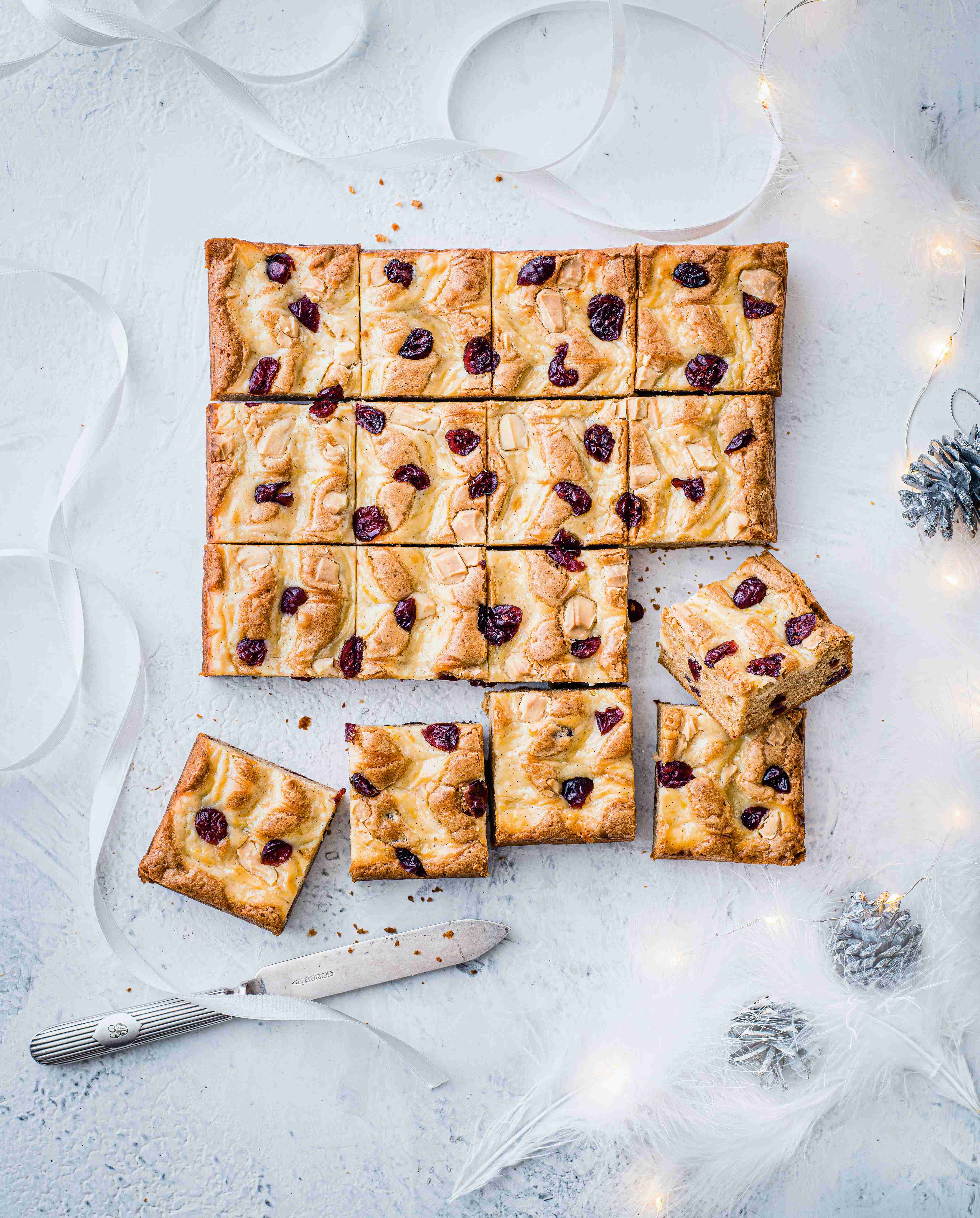 Blondies možná vypadají jako obyčejná buchta, ale nenechte se mýlit. Navíc tahle světlá varianta z bílé čokolády je úplně dokonalá. Při bližším pohledu zjistíte, že vláčné těsto je posypané nejen brusinkami a bílou čokoládou, ale také mramorované krémovým sýrem – dezert je tedy hříšnou kombinací blondies a cheesecaku.