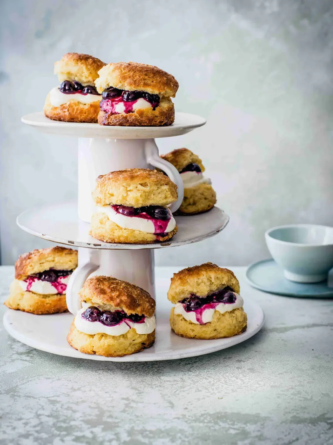 Pořádat čaj o páté a vynechat scones? Vyloučeno! Jemné máslové bochánky jsou jasnou britskou klasikou. My jsme je trochu pozměnili, inspirovali jsme se americkými shortcakes z křehkého těsta s podmáslím, které strukturou připomíná těsto listové. A tradičně podávaný džem jsme nahradili čerstvě svařenými borůvkami. Nevynechali jsme ovšem smetanovou náplň.