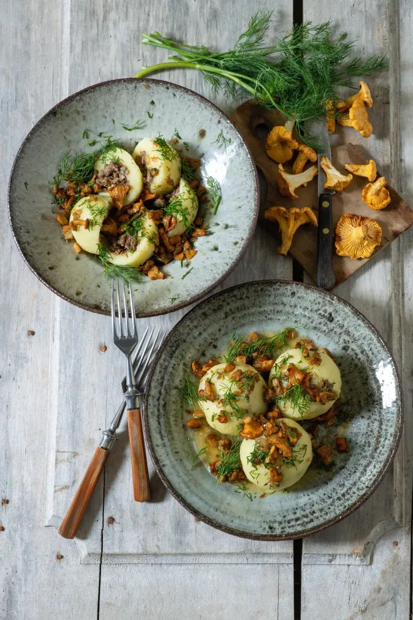 Bramborové knedlíky plněné uzeným masem a se zelím určitě znáte, ale už jste ochutnali ty plněné mletým masem a sypané liškami? Spojení medu, octa, hub a kopru vypadá divoce, ale báječně zvýrazní chuť a křupavost hub. Delikatesa!