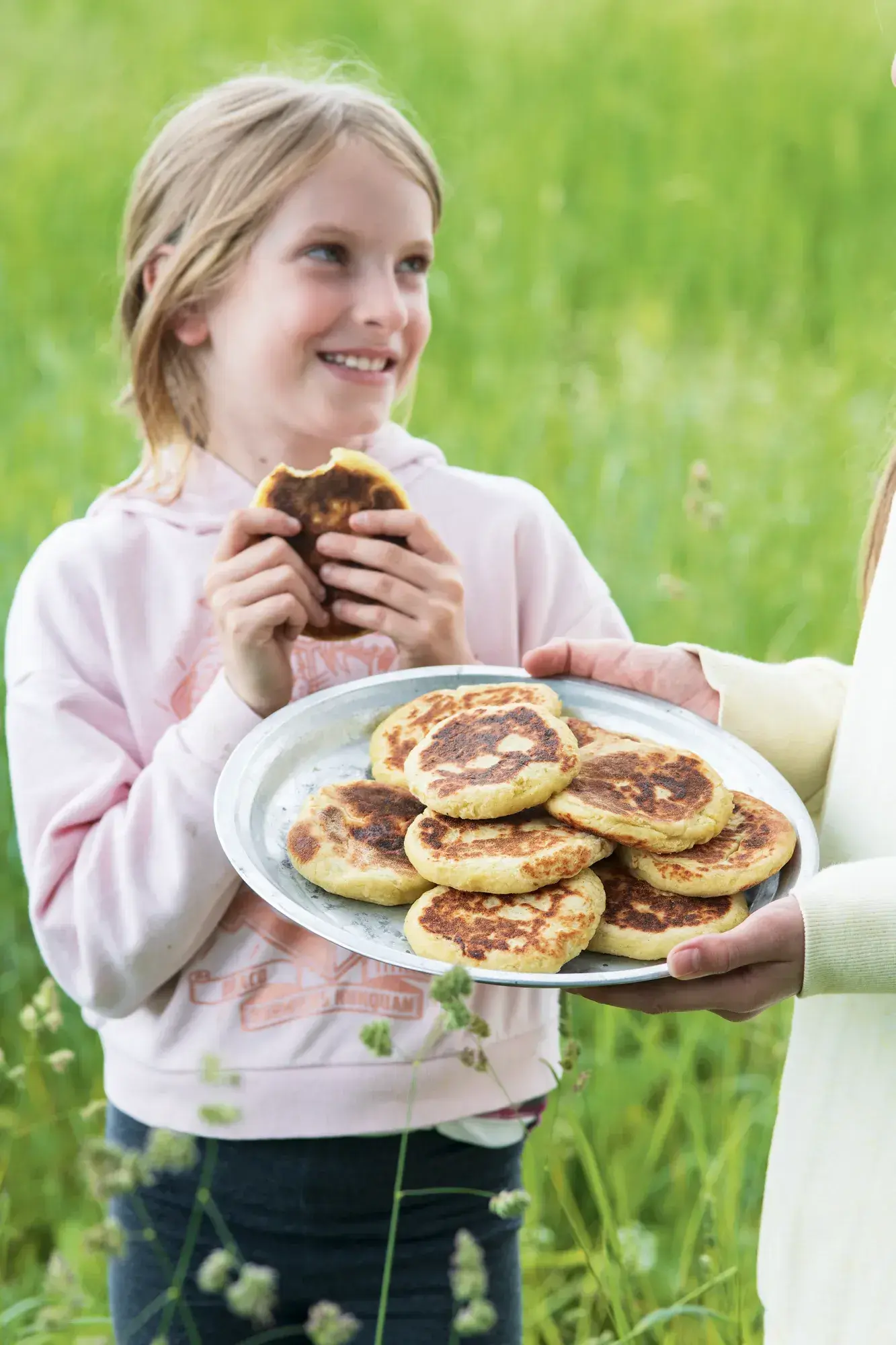 V tomhle receptu na bramborové placky vsaďte na starší brambory a polohrubou mouku. Těsto se pak tolik nechytá. Pokud se obáváte, že nenajdete kameny na pečení, přibalte ešus a pečte na víčku. S opékáním a chutí pomůže i tuk, dobré je třeba sádlo.