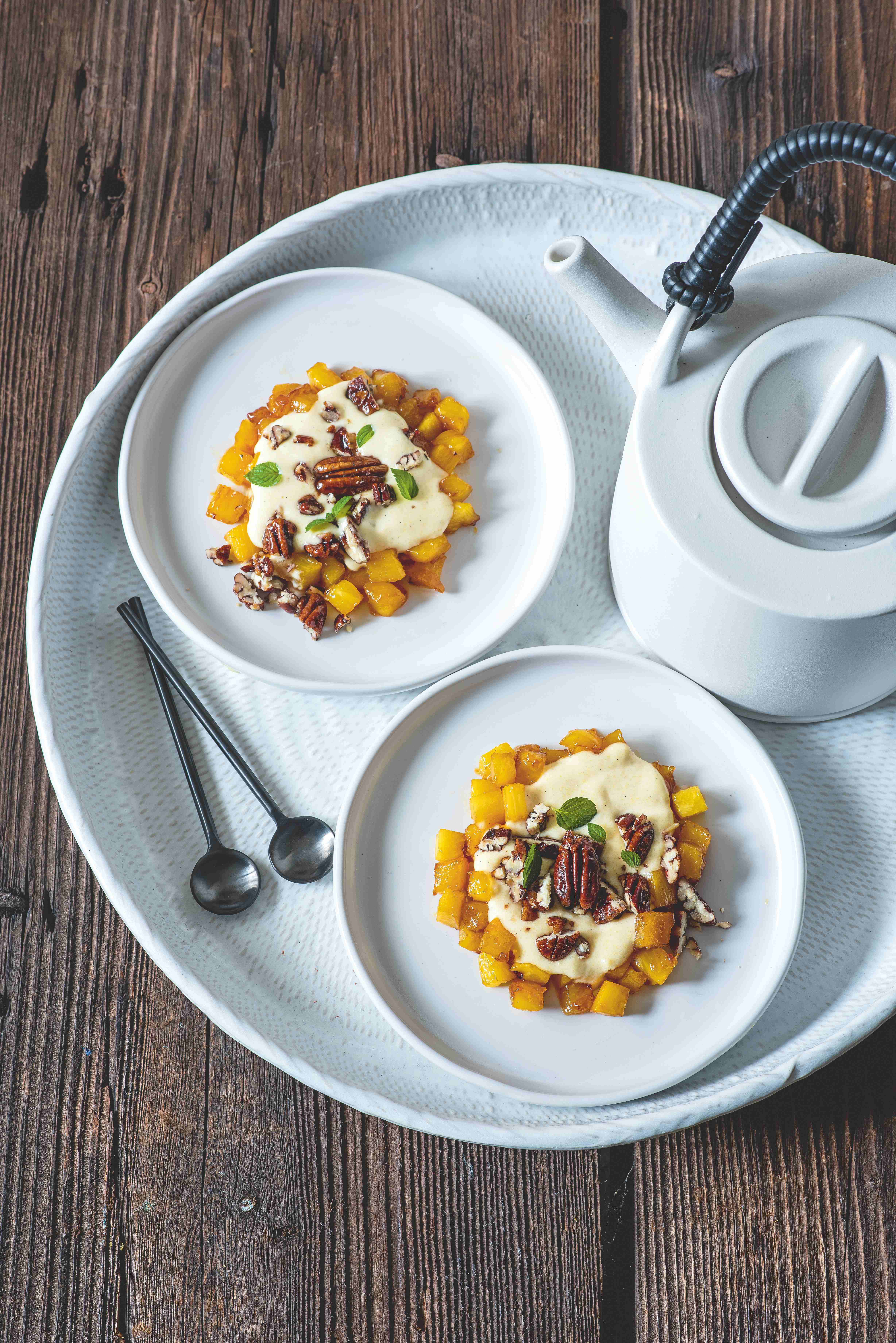 Bramborový mousse s pečeným ananasem a javorovými pekany je neskutečně zábavný dezert, doslova z pár surovin, příprava je snadná a výsledek neuvěřitelně dobrý! Tahle sladká tečka ztělesňuje comfort food na úrovni michelinské restaurace.