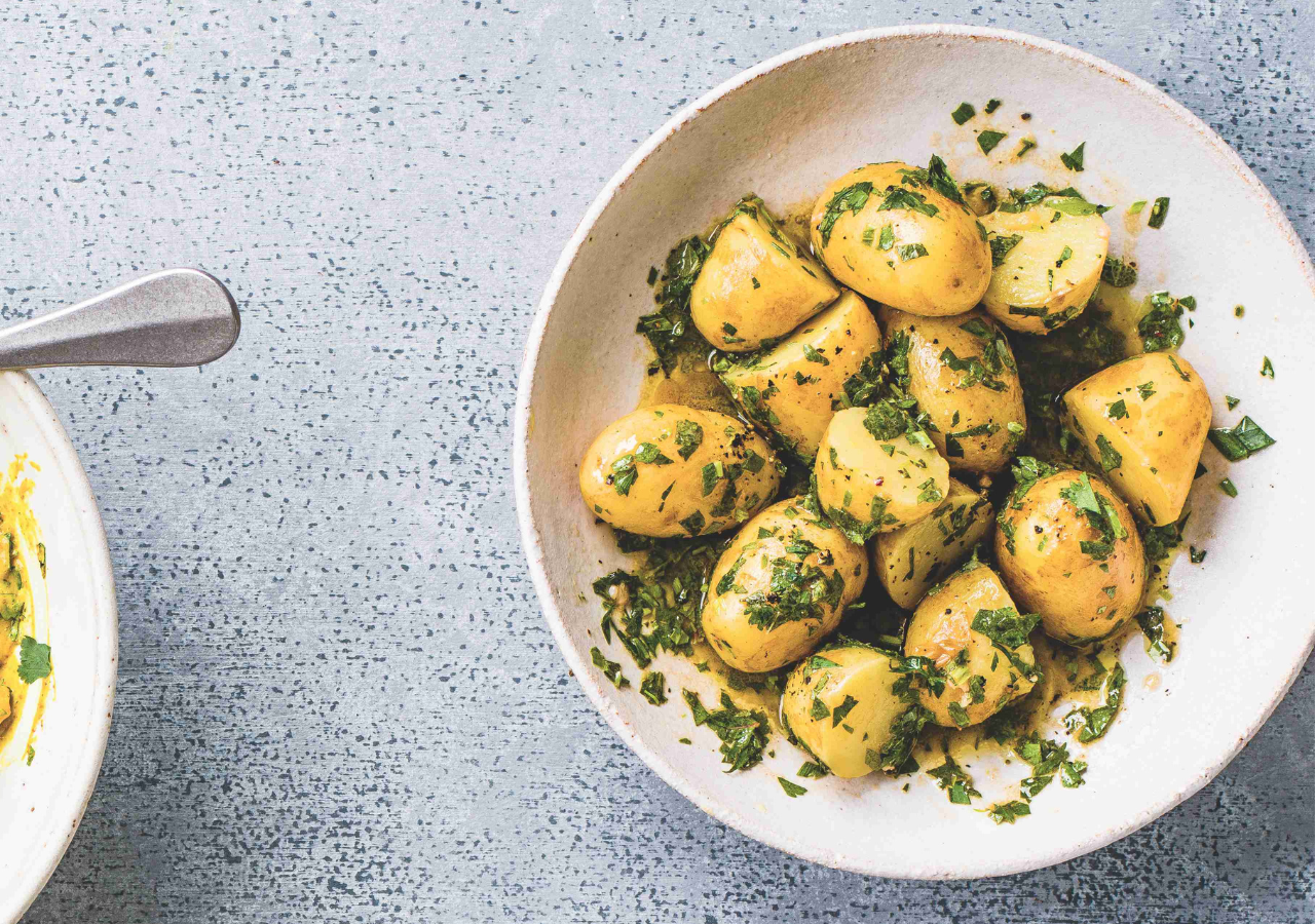 Netradiční bramborový salát poslouží jako příloha k jednoduše upravenému masu, seitanu, tempehu nebo tofu pro čtyři osoby.