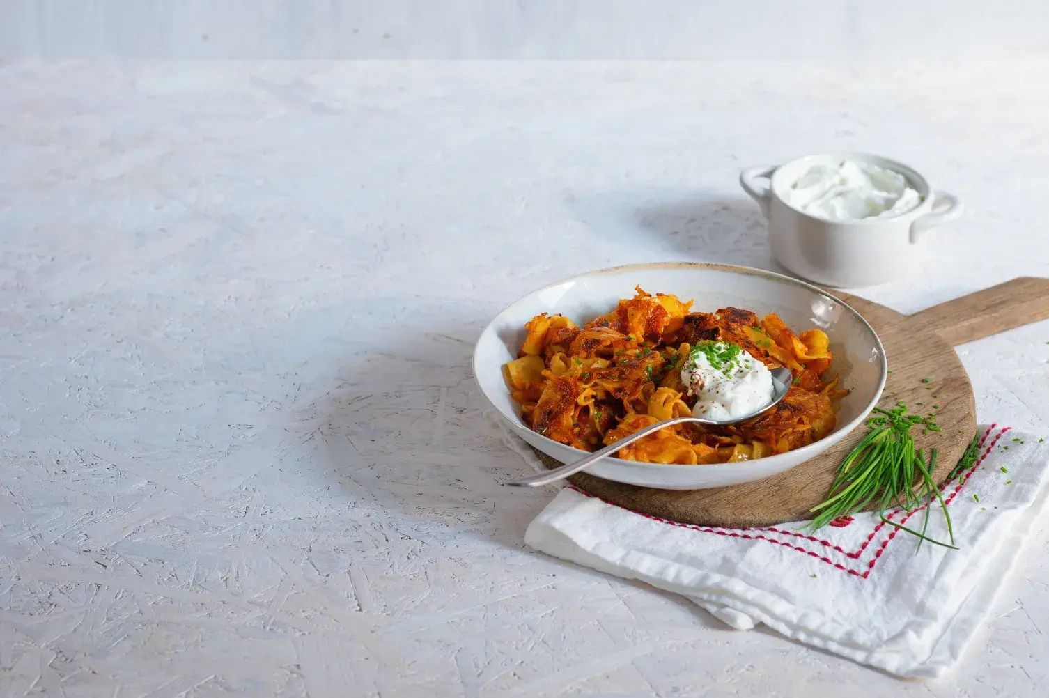 Recept na brambory s těstovinami koluje ve středoevropském prostoru v různých obměnách nejčastěji jako granadýr nebo grenadýrmarš. V Maďarsku mu říkají krumplis tészta a právě ‚uherskou’ verzí jsme se inspirovali. Mletá paprika dodá téhle lidové lahůdce skvělou chuť.