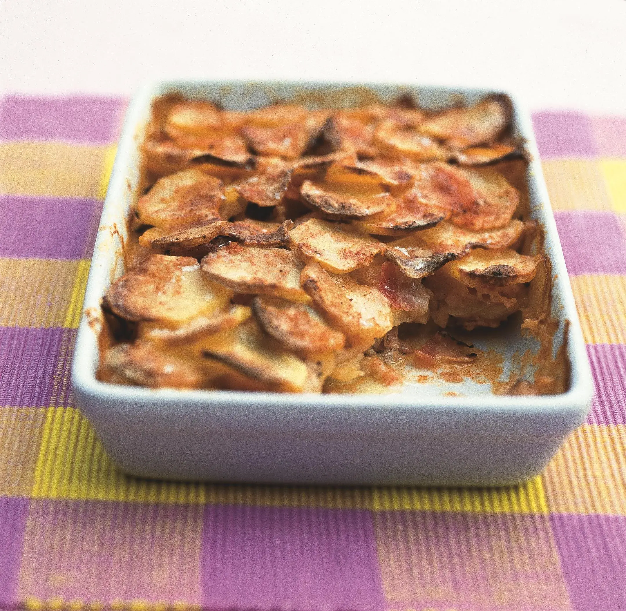 Zapečené brambory se slaninou se hodí jako příloha i samotné hlavní jídlo. Stačí jen vrstvit plátky brambor, kostičky slaniny a mouku, nakonec vše zalít horkým mlékem. Mléko spolu s moukou vytvoří jemnou omáčku, která brambory báječně ,spojí‘. Fantastické jídlo téměř bez práce...
