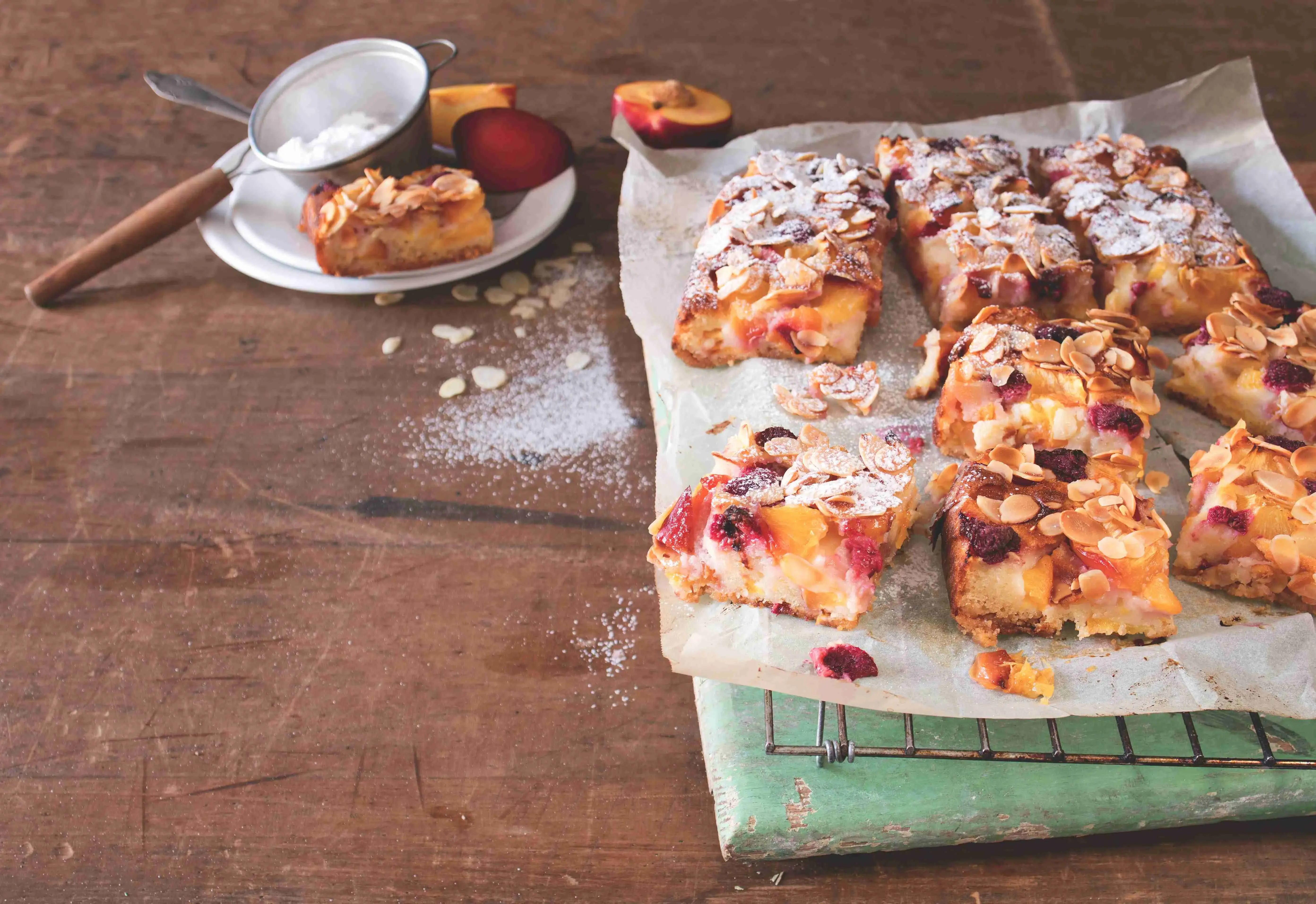 Vespod křupavý, uvnitř šťavnatý, navrch posypaný spoustou mandlí... Tenhle koláč na plech je náš nový letní favorit!