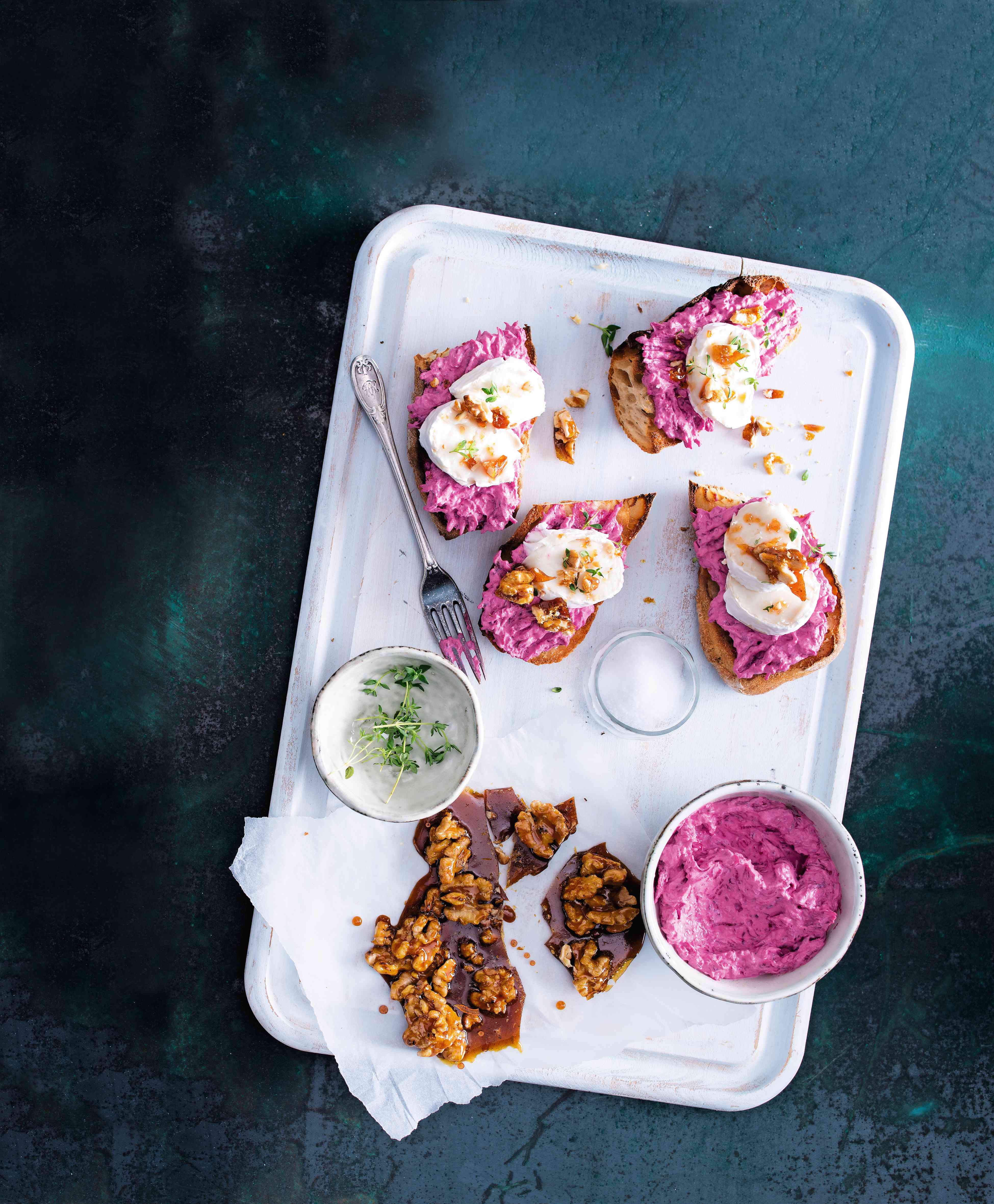 Červená řepa a kozí sýr je možná trochu kontroverzní kombinace, ale až ochutnáte, budete ji vynášet do nebes! Bruschetta s pomazánkou z červené řepy & karamelizovanými ořechy je zaručený party hit.