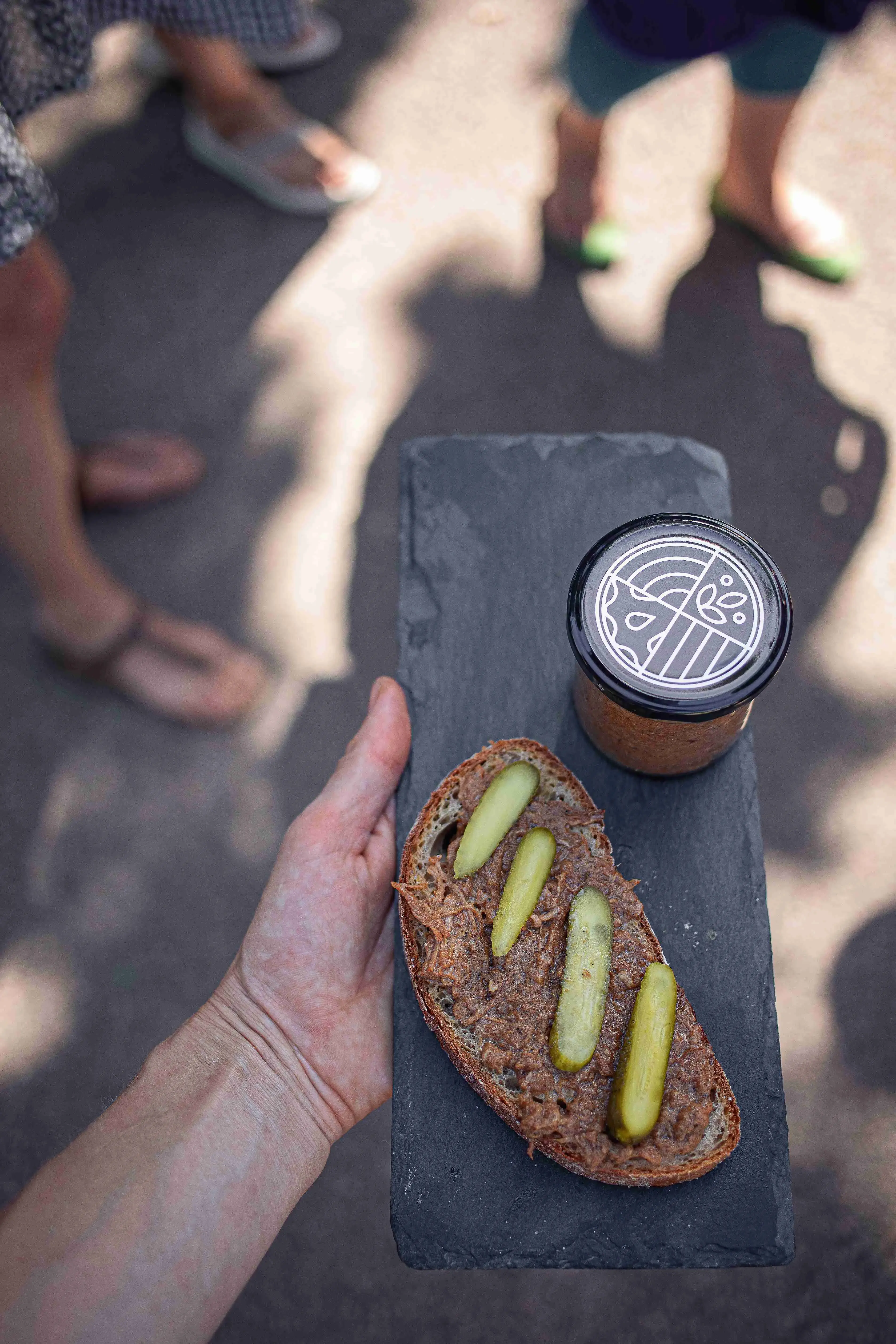 Dokonalou bůčkovku jsme na Apetit pikniku ochutnali u stánku Nesu Koláč Kláry Chvojkové. „Občas si říkám, jak je to jednoduché a jestli recept na pomazánku něčím nevylepšit, ale pak dojdu k závěru, že je to zbytečné. Takhle prostě funguje nejlépe. Nejdůležitější je bůček opravdu pořádně rozdusit,“ radí Klára.